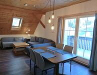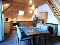 Das geräumige Wohn-/Esszimmer verfügt über Sat-TV sowie einer offenen, gut eingerichteten Einbauküche (Geschirrspülmaschine, großer Kühlschrank mit 3*-Gefrierfach, Kaffeemaschine (Filter), Wasserkocher, Eierkocher, Toaster, Mixer).