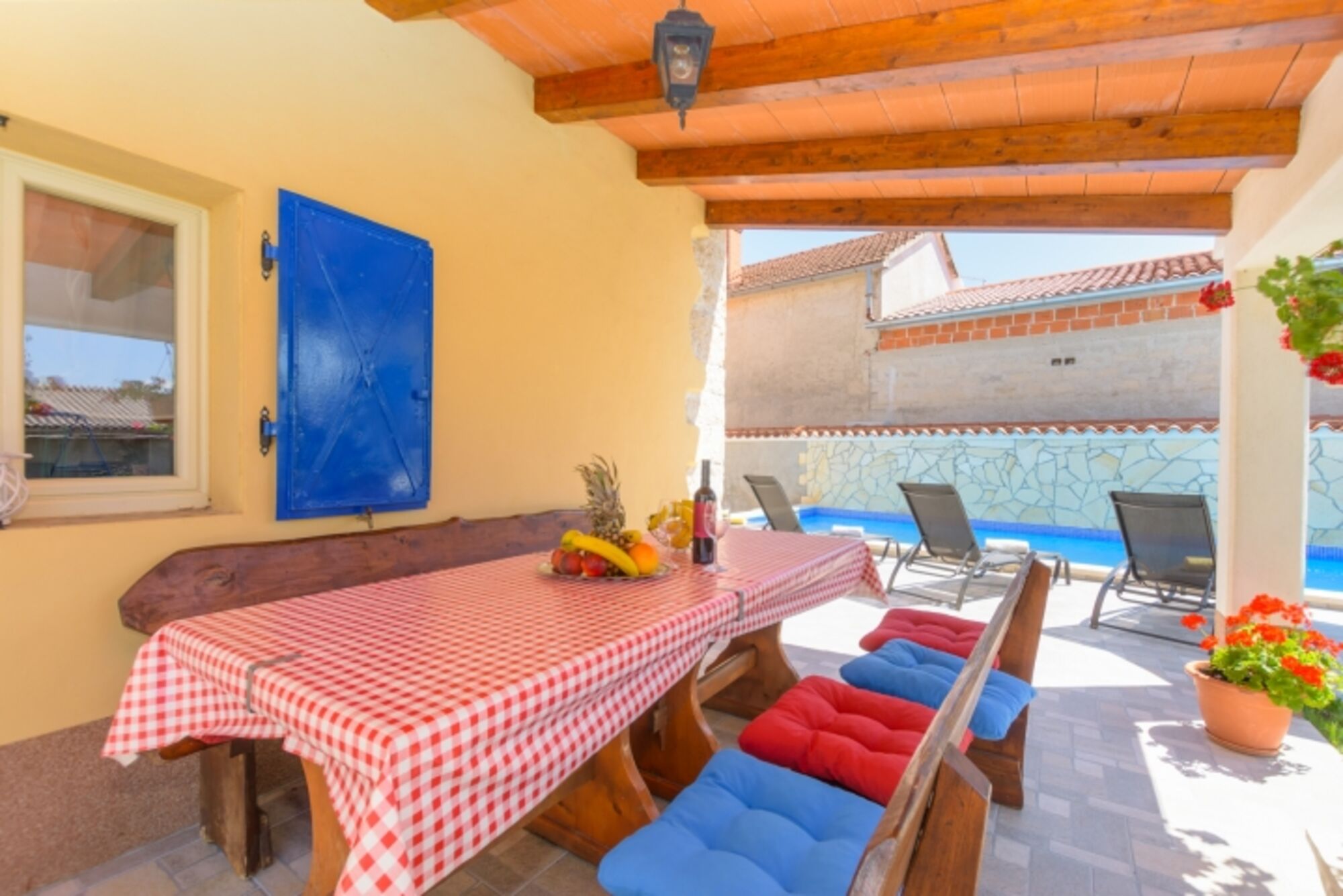 Auf dem eingezäunten Grundstück befindet sich ein privater Pool mit überdachter Terrasse und Grill – perfekt zum Entspannen und für geselliges Beisammensein im Freien. Liegestühle und ein gemütlicher Bereich rund um den Pool laden dazu ein, sonnige Sommertage zu genießen.