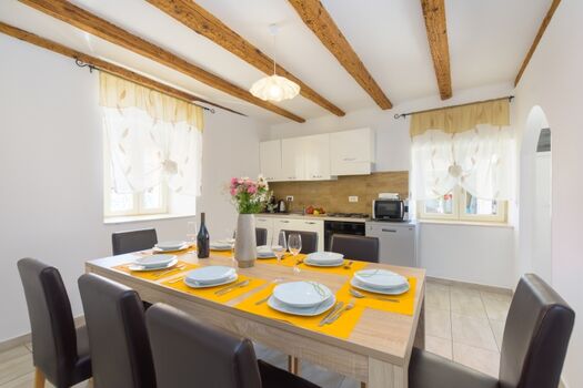 Die Villa Mikula ist ein renoviertes Ferienhaus im kleinen istrischen Dorf Klimni, unweit von Žminj. Sie ist ideal für Gäste, die Privatsphäre und ein authentisches ländliches Ambiente suchen, und erstreckt sich über drei Etagen, die durch Innentreppen verbunden sind. Das Dachgeschoss hat eine Mindestdeckenhöhe von ca. 120 cm, was dem Raum besonderen Charme und Wärme verleiht.