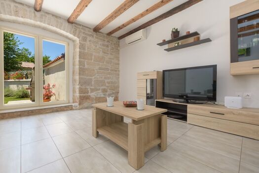 Die Villa ist sorgfältig eingerichtet und komplett ausgestattet. Das geräumige Wohnzimmer, die Küche und der Essbereich bieten idealen Platz für gemeinsame Momente, während die drei Etagen ausreichend Privatsphäre für größere Gruppen oder Familien gewährleisten. Jedes Detail unterstreicht die Wärme und Authentizität des istrischen Stils.