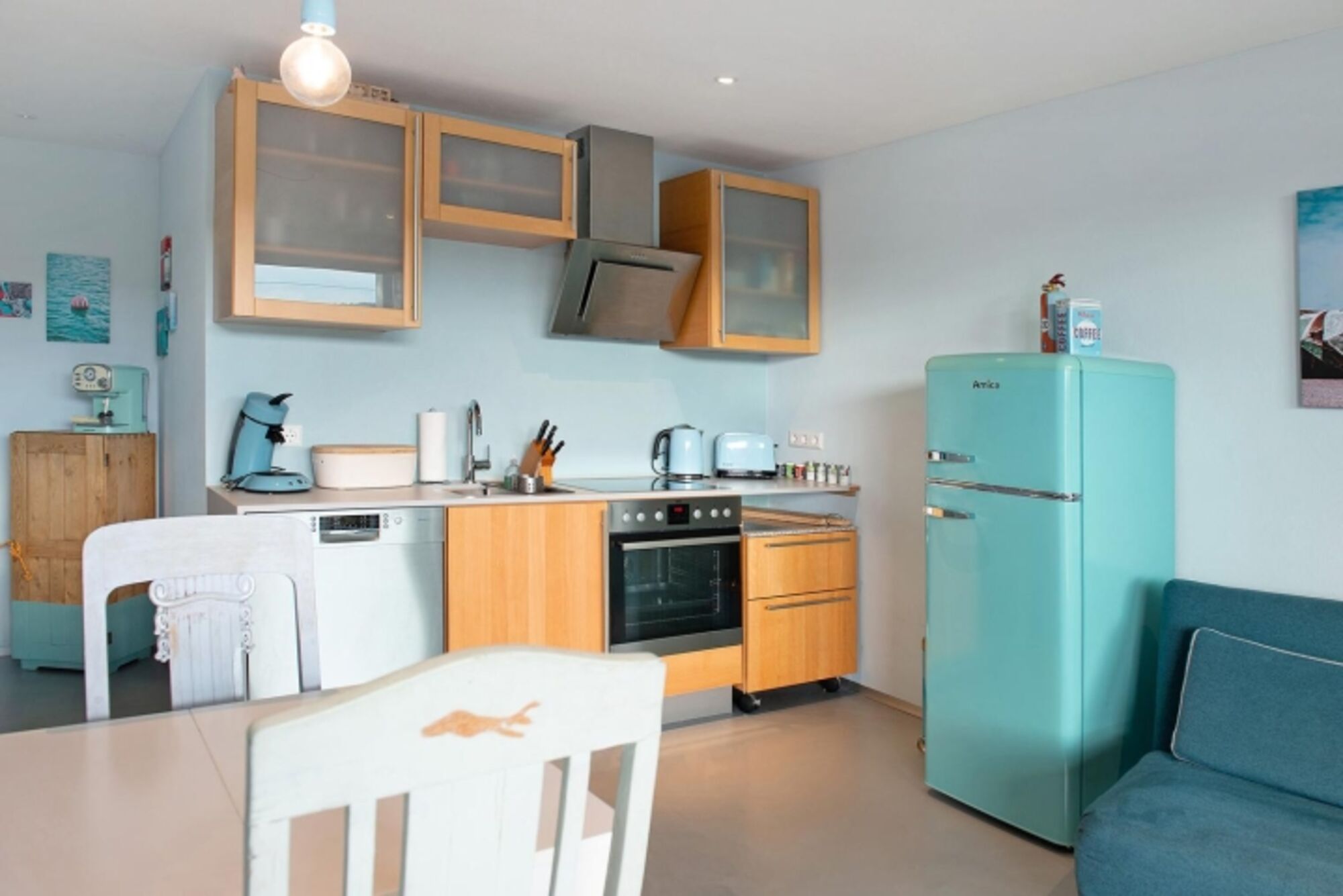 Ein kleiner weißer ausziehbarer Holztisch und liebevoll restaurierte, gepolsterte Vintage-Stühle laden zu unterhaltsamen Stunden bei Tisch.