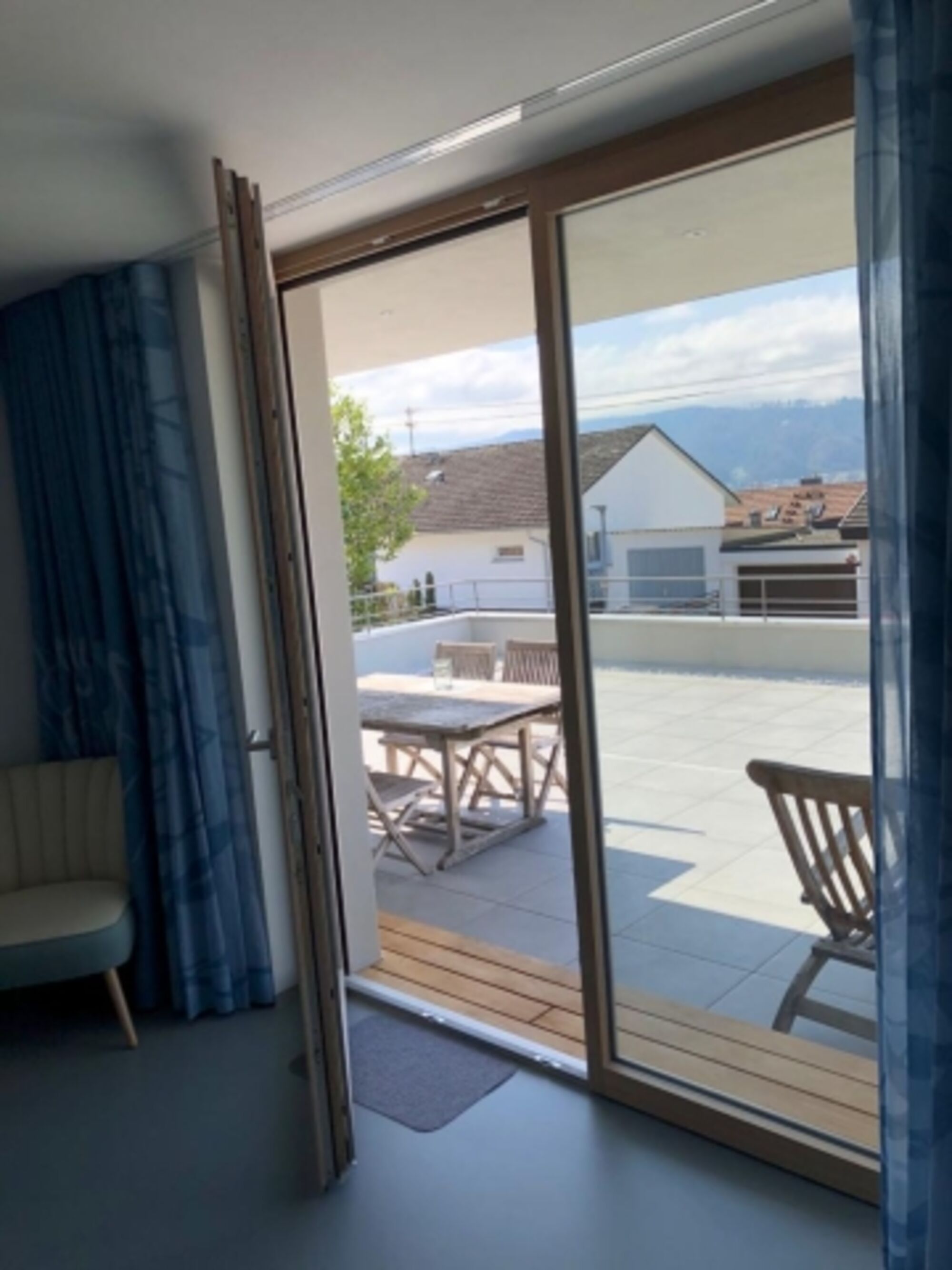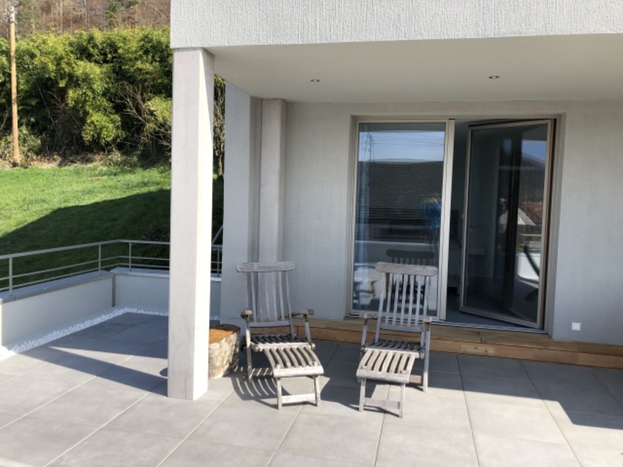 Bequeme Liegestühle laden zum Sonnenbaden ein. Das Apartment ist mit einem Design-Fußboden im Betonlook von der ‘Art on Floor‘-Designerin Jeanet Hönig, sowie gemütlichen Sesseln und einem bequemen Kingsize-Boxspringbett ausgestattet.