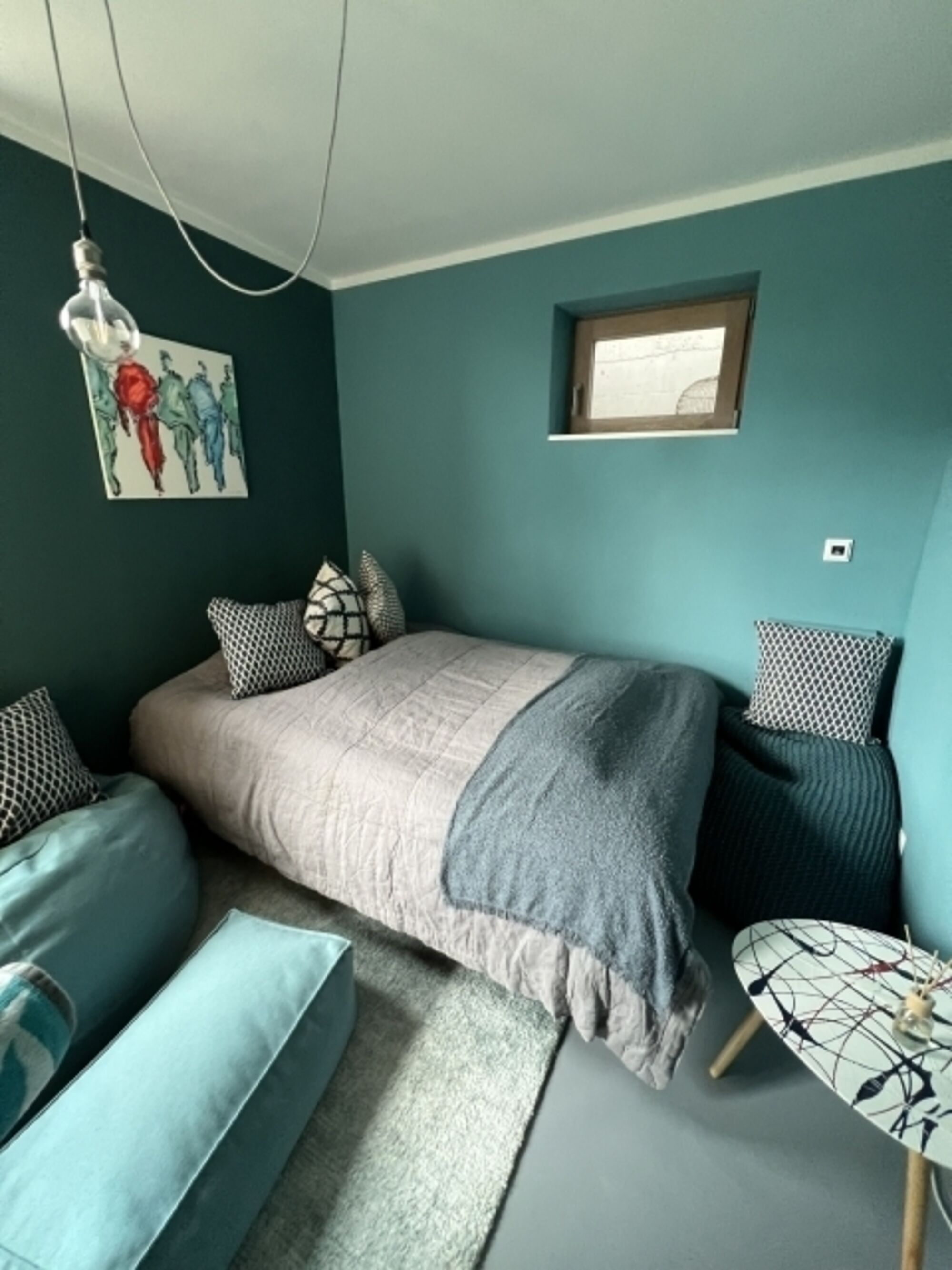 Das Zusatzschlafzimmer SeeLiebe No 17 liegt gegenüber der Ferienwohnung SeeZeichen No 26 und neben der Sauna, die über eine Toilette und Dusche mit sehr kleinem Waschbecken verfügt. Das Highlight des kleinen SeeLiebe Apartments ist das große Sitzfenster, das zweite Fenster geht Richtung Garten und das dritte Fenster Richtung Lichtschacht. Das SeeLiebe-Apartment No 17 verfügt über eine Infrarot Heizung und nicht, wie die anderen Apartments, über eine Fußboden -Heizung. Das Schlafsofa ist mit einer doppelten Matratze ausgestattet damit man erholsame Nächte genießen kann. Kommode, Leselampe am Bett, Fliegengitter