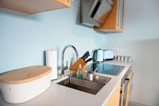 4-Platten Herd, Cerankochfeld, Dunstabzugshaube, Kühlschrank mit Gefrierfach, Senseo-Kaffeeautomat, Mixer, Korkenzieher / Flaschenöffner, Gewürze (Salz, Pfeffer, Zucker), Öl / Essig, Geschirrhandtücher, Mülltüten, Essplatz in der Küche, TV in der Küche