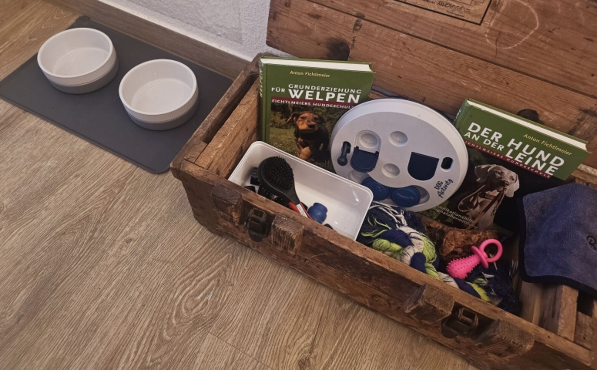 Napf, Hundekorb, Leine, Leckerli, Unterlage, Spielzeug