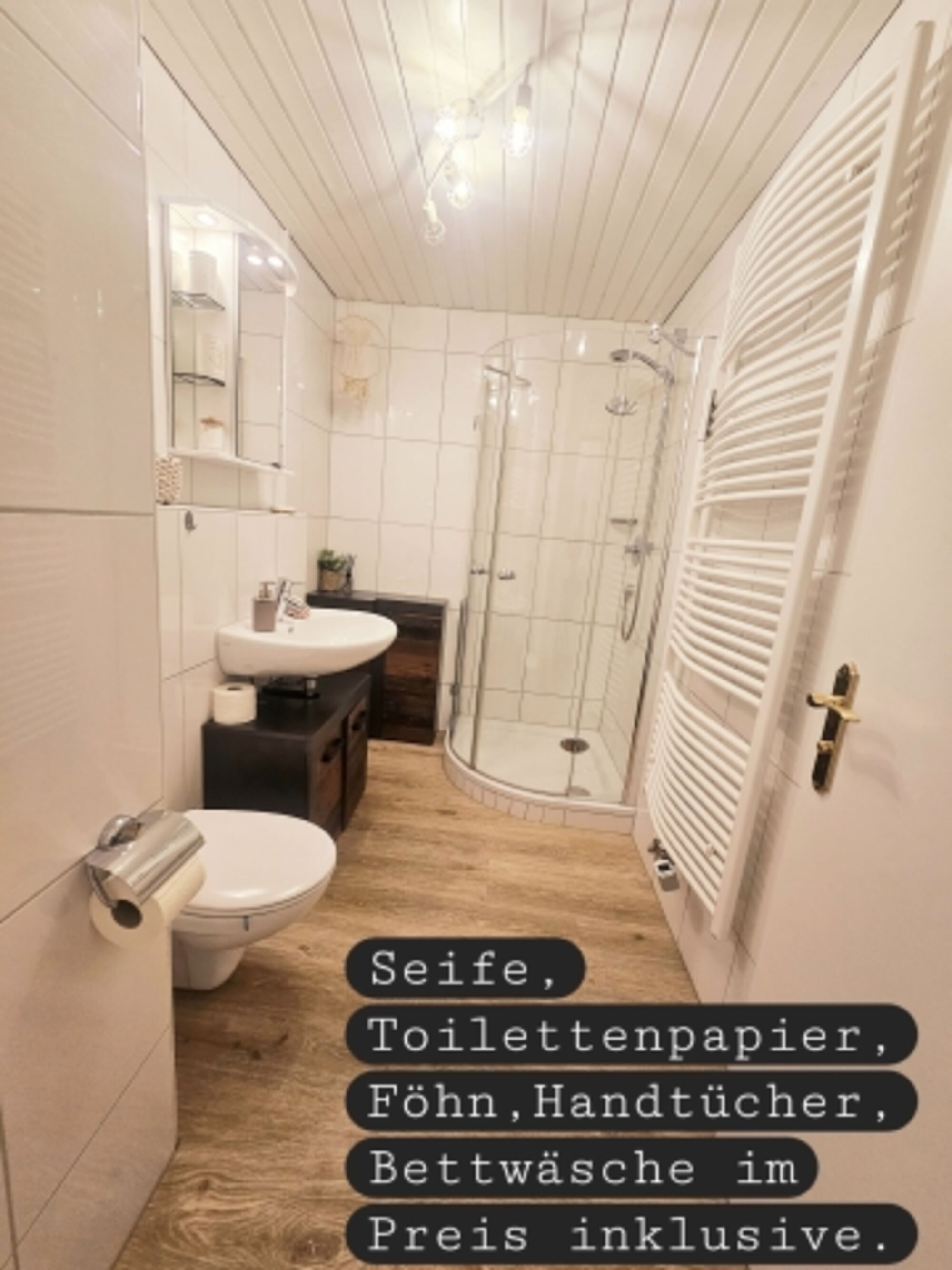 Bad mit Badewanne oder Dusche, Waschbecken und WC. Föhn und Kosmetikspiegel. Wattepads, Ohrenstäbchen, Toilettenpapier inklusive.