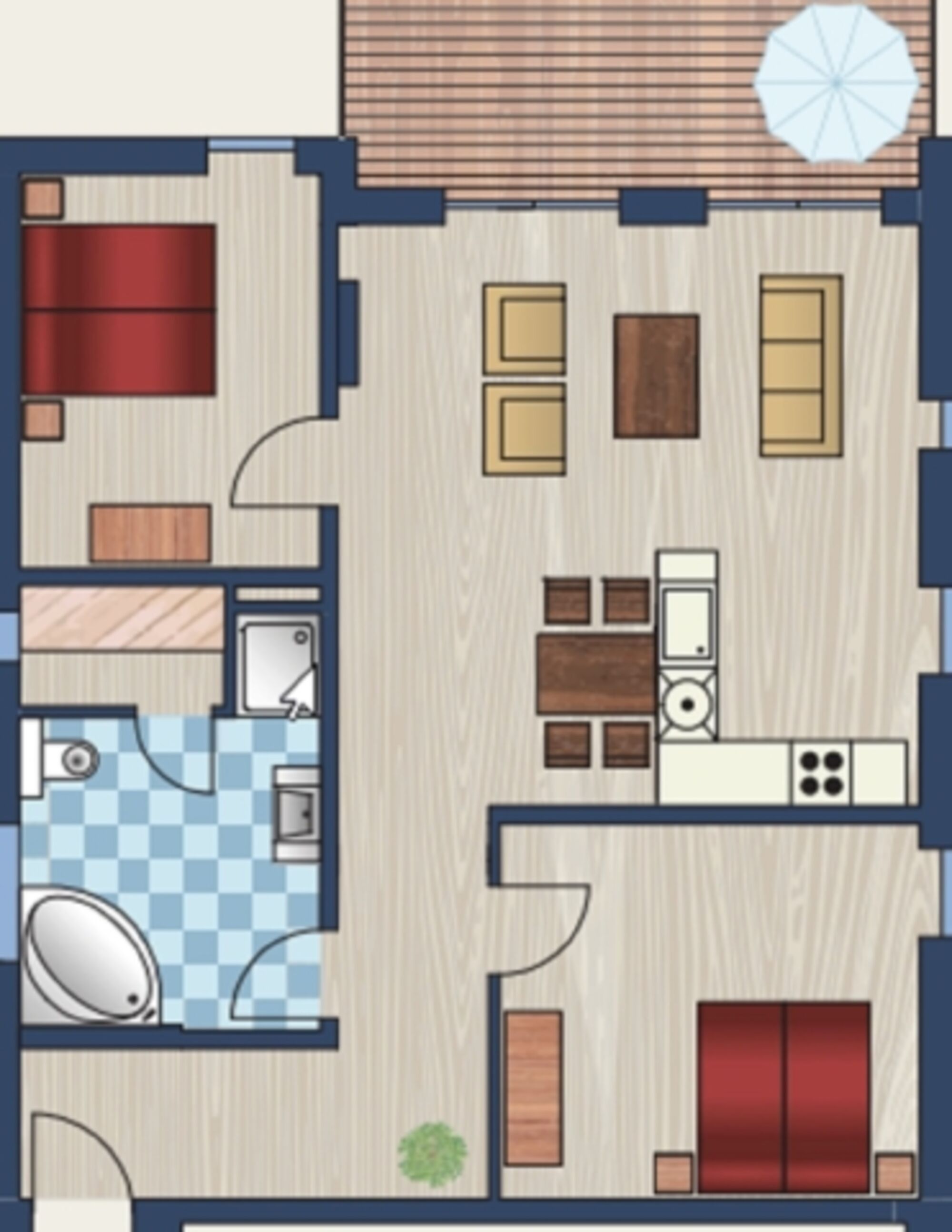 Zwei Schlafräume und der großzügige Wohnbereich mit offener Küche heißen Sie herzlich willkommen.