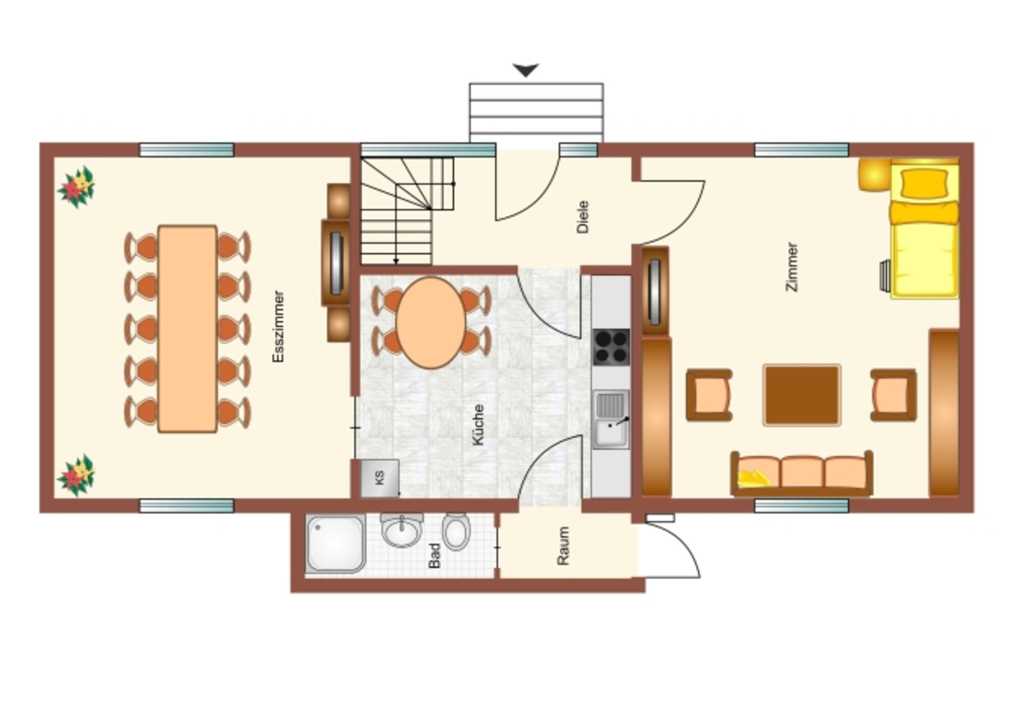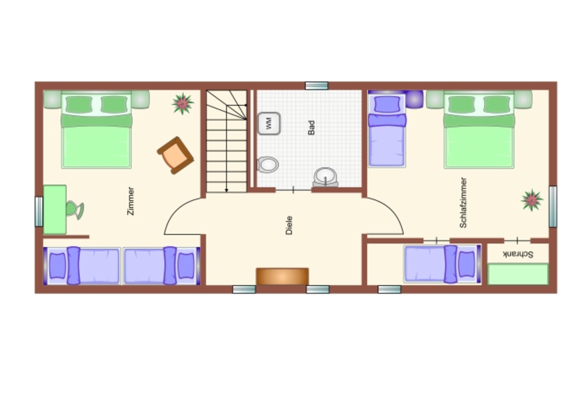 Auf ca. 130 qm bietet das Haus auf zwei Etagen Schlafmöglichkeiten für bis zu 8 Personen.