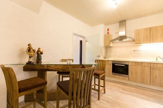 Cerankochfeld, Dunstabzugshaube, Kühlschrank mit Gefrierfach, Essplatz in der Küche
