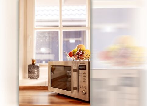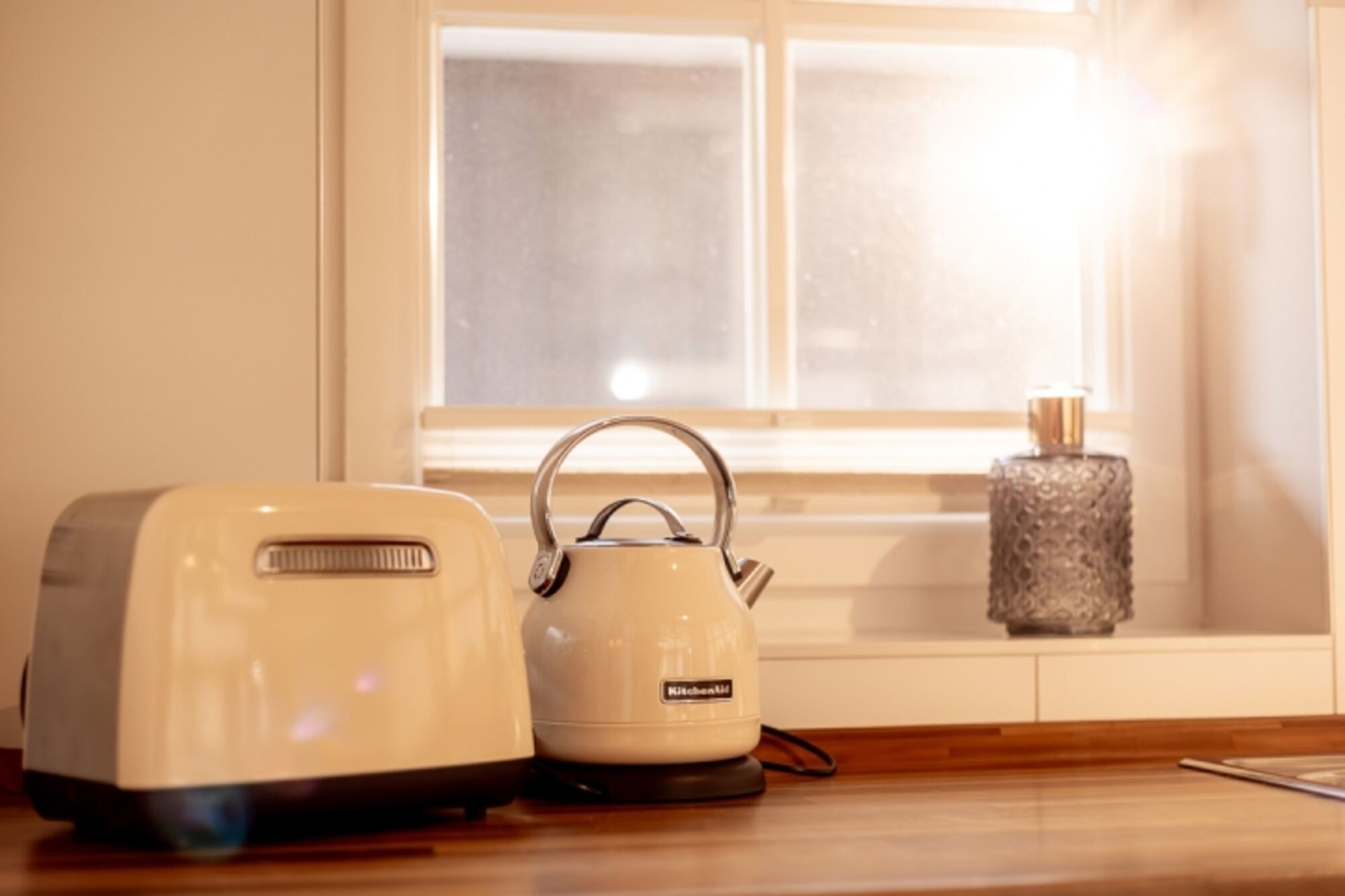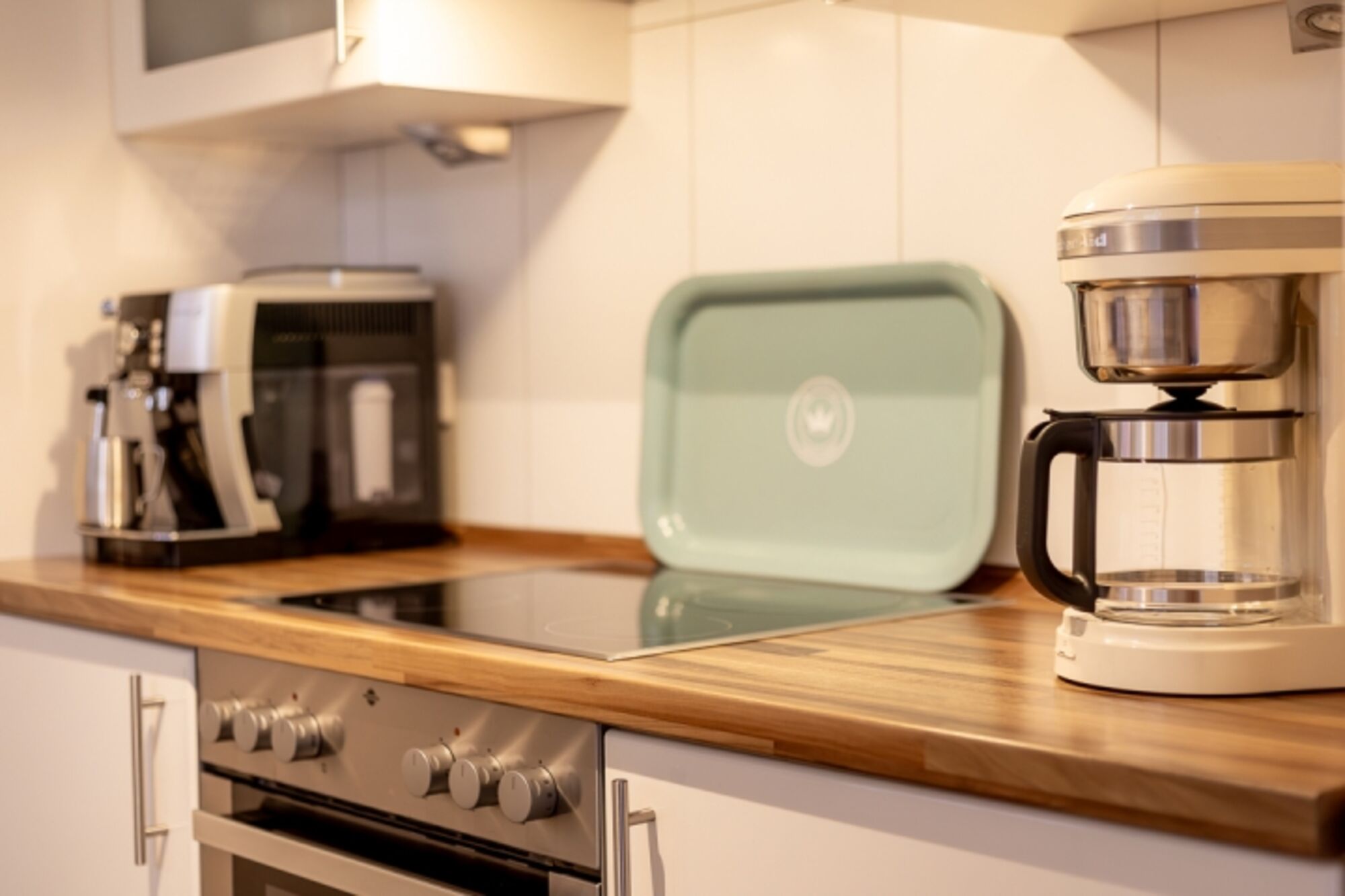 Cerankochfeld, Dunstabzugshaube, Kühlschrank mit Gefrierfach, Senseo-Kaffeeautomat, Eierkocher, Korkenzieher / Flaschenöffner