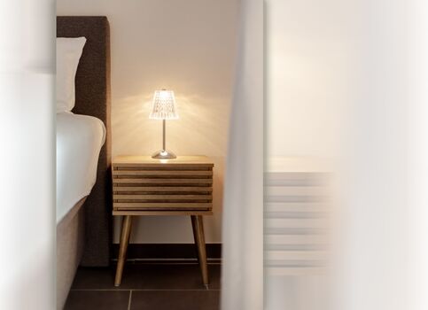 Verdunklung durch Gardinen Doppelbett 1,80 x 2,00m, Boxspringbett, Leselampe am Bett, Fliegengitter