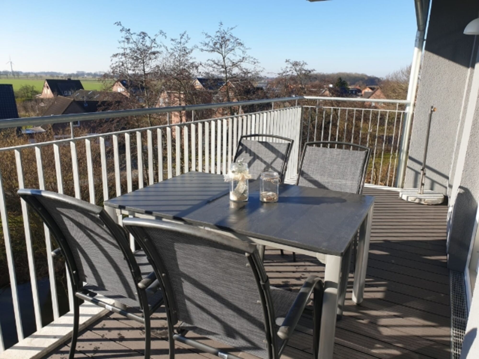 Ein großzügiger, möblierter und überdachter, nach Süden zum Wasserlauf ausgerichteter Balkon lädt zum Verweilen ein.