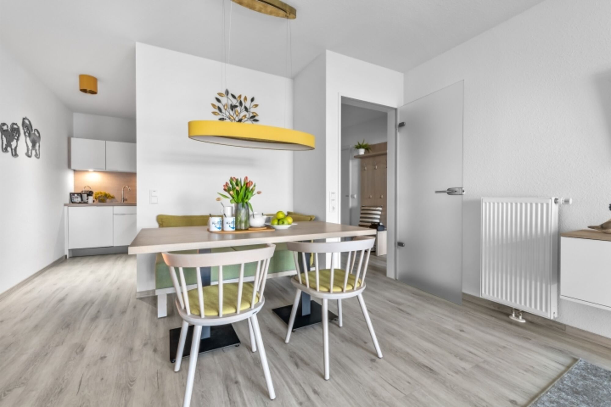 Cerankochfeld, Dunstabzugshaube, Kühlschrank mit Gefrierfach, Gefrierschrank, Nespresso-Automat, Eierkocher, Mixer, Korkenzieher / Flaschenöffner, Geschirrhandtücher, Essplatz in der Küche