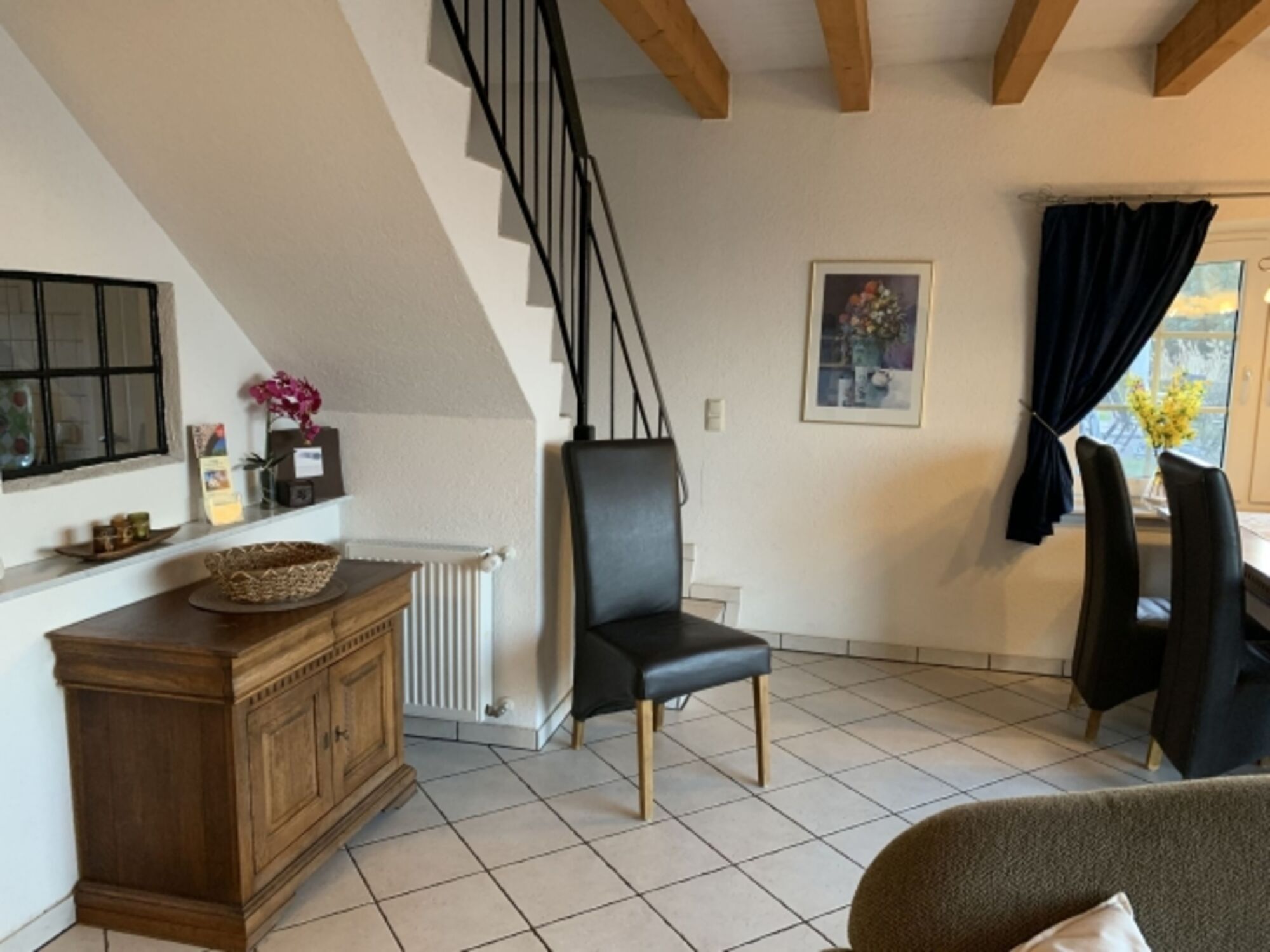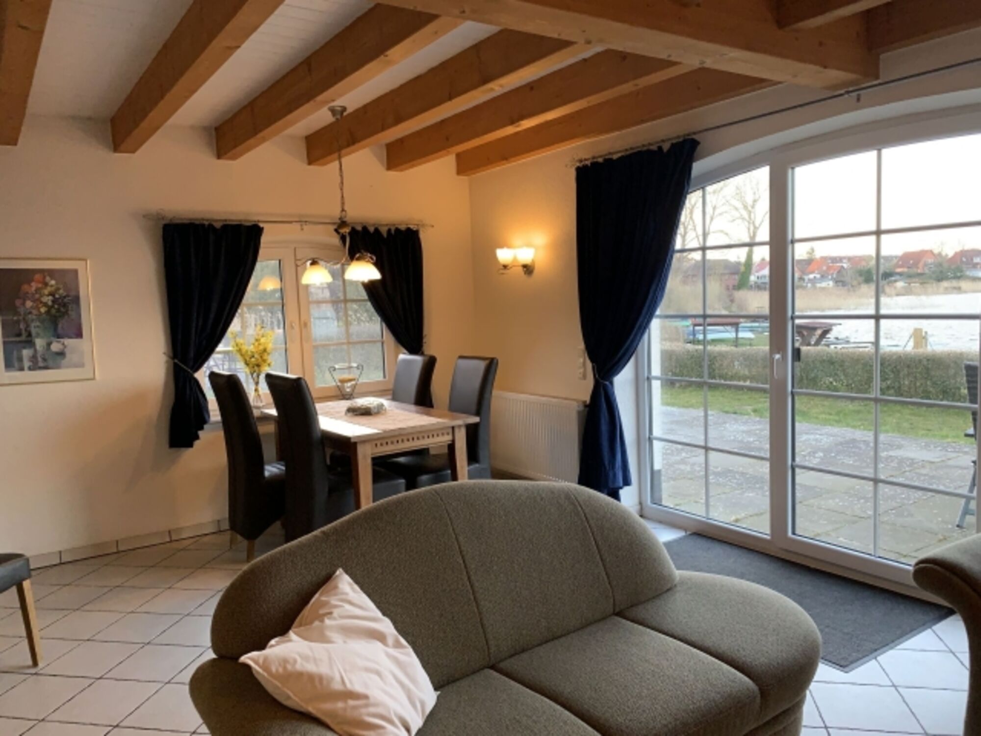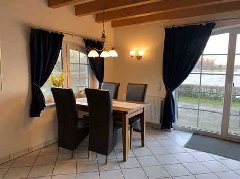 Das gemütliche Wohn- und Esszimmer mit Kaminofen, Flachbild-TV, HiFi-Anlage, Fliesenfußboden mit Fußbodenheizung sowie einem direkten Blick auf den See wartet auf Ihren Besuch.