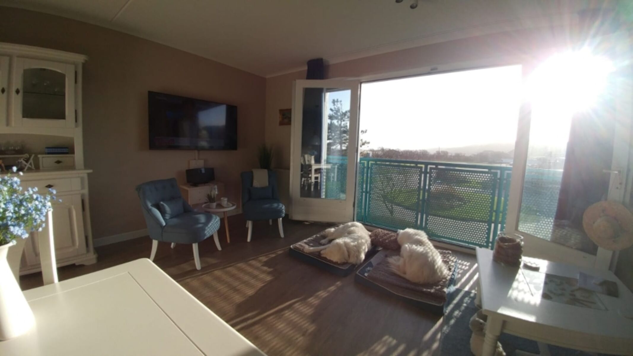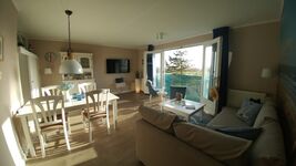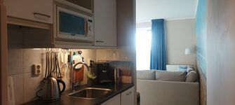 Der Wohnbereich unseres Appartements verfügt über einen Esstisch mit bequemen Sitzmöglichkeiten für 4 Personen. Das ausziehbare Ecksofa ist bequem und lädt nach ausgiebigen Spaziergängen zu entspannten Abenden vorm großen Flachbildfernseher (digitaler Empfang) ein. Eine Stereoanlage ist ebenfalls vorhanden. Die offene Küche ist vollständig eingerichtet und lässt keine Wünsche offen. Sie verfügt über einen Kühlschrank mit Gefrierfach, eine Mikrowelle, ein Cerankochfeld und einen Geschirrspüler