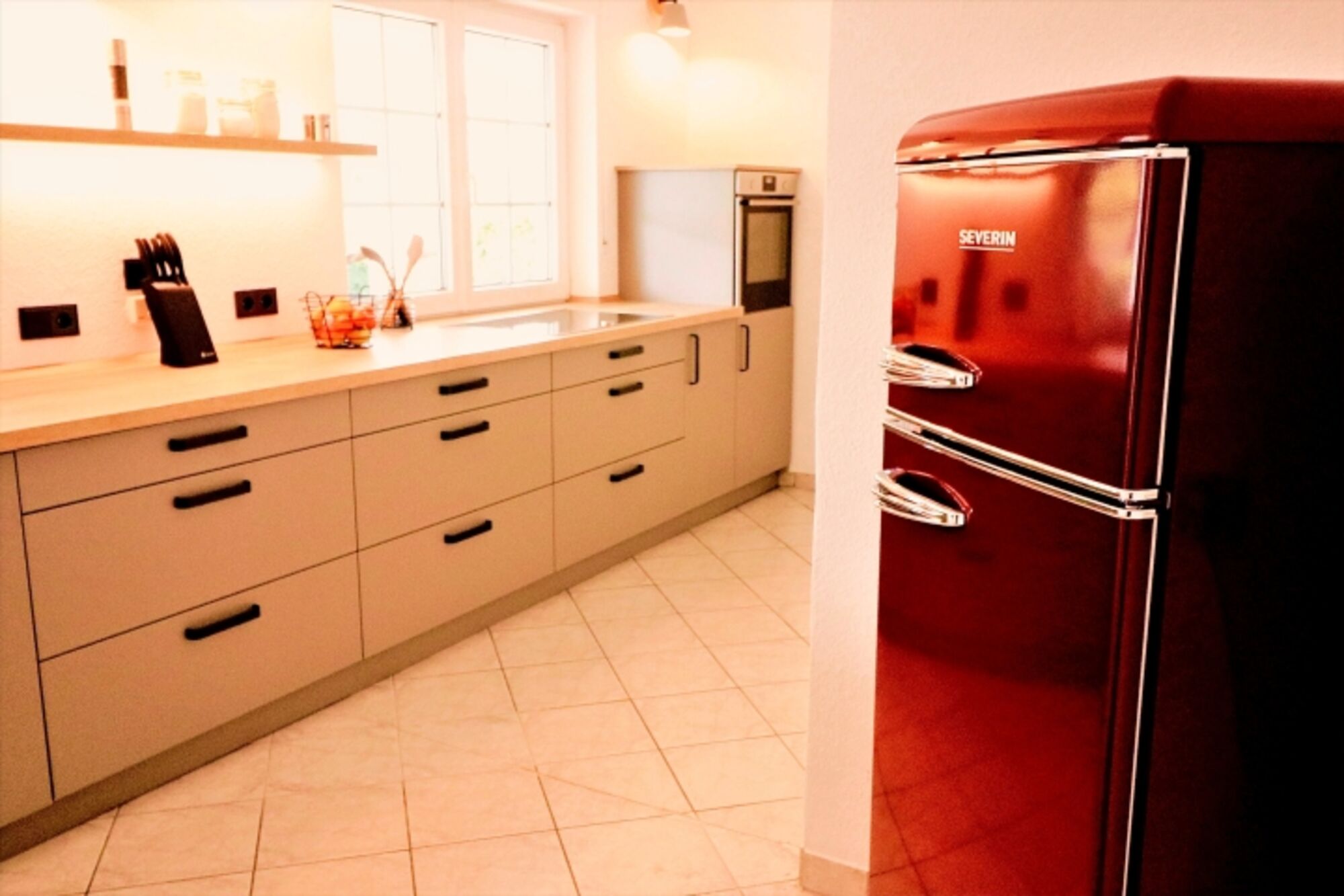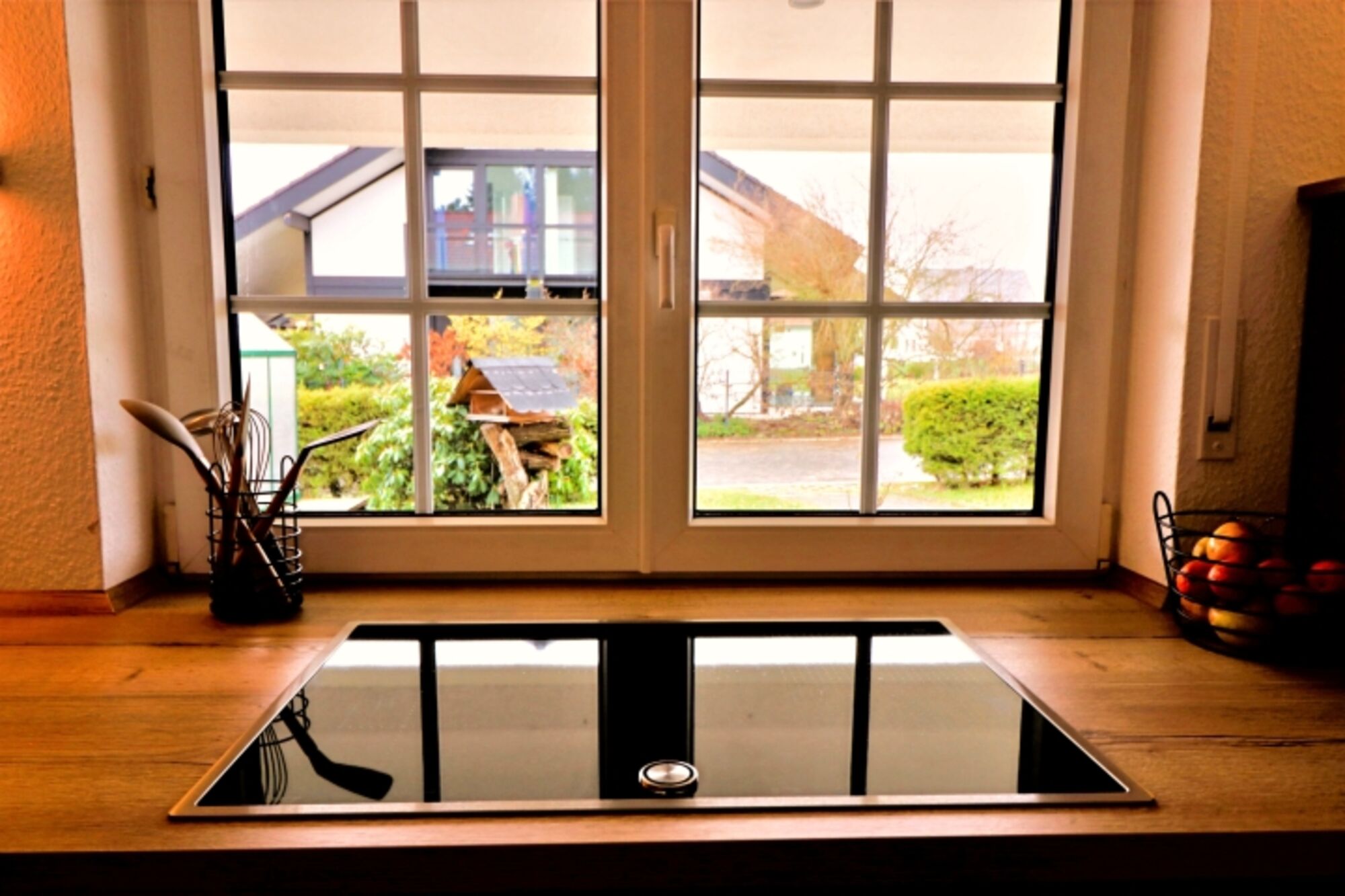 Induktionsherd, Kühlschrank mit Gefrierfach, Mixer, Korkenzieher / Flaschenöffner, Gewürze (Salz, Pfeffer, Zucker), Öl / Essig, Geschirrhandtücher, Mülltüten