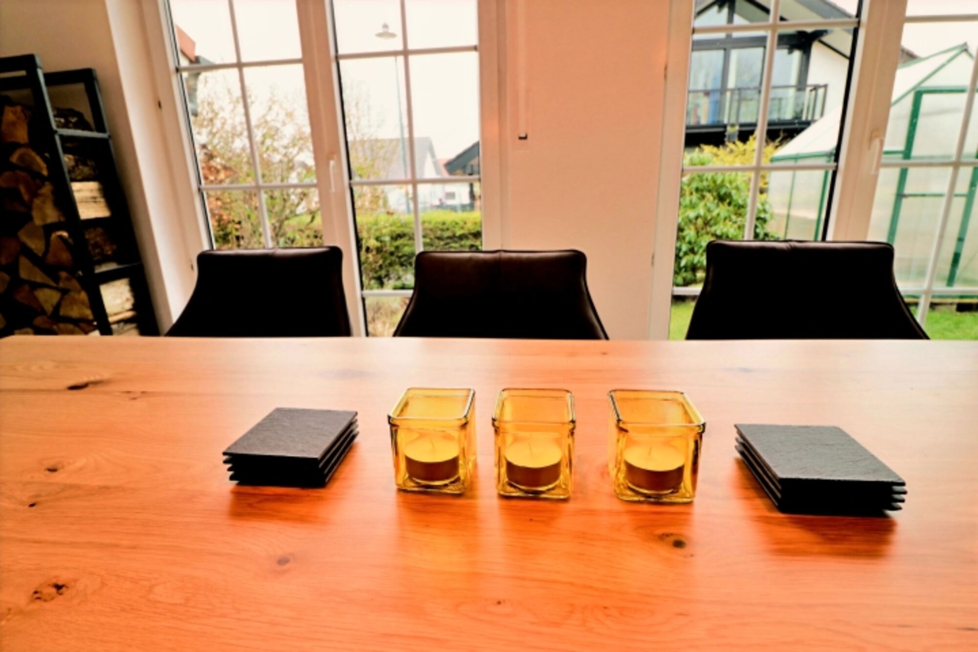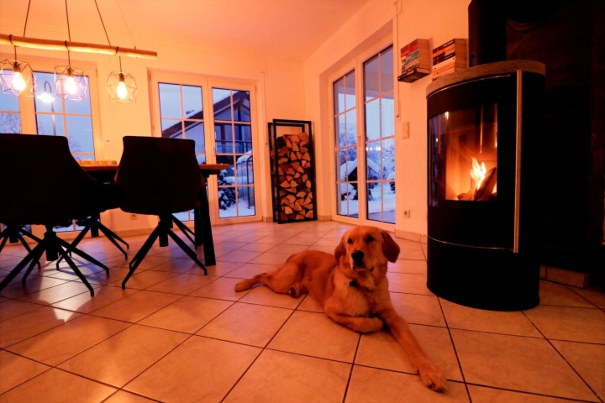 SMART-TV, Bücher, Kaminofen, Eckcouch