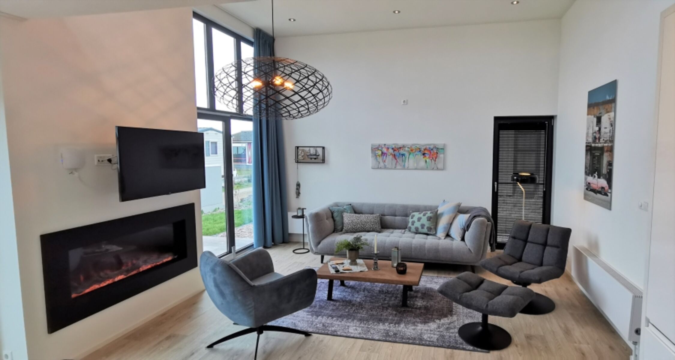 Großer, gemütlicher und liebevoll eingerichteter Wohn-/Essraum mit großen, bodentiefen Fenstern und Zugang zur Terrasse über 2 Schiebetüren mit Blick auf das IJsselmeer. Der moderne Ambiente-Kaminofen mit wählbarem, variablem Farbenspiel bietet pure Abend-Entspannung und faszinierende Atmosphäre. Eine Aircondition sorgt im Sommer bei heißen Temperaturen für angenehmes Innenklima.