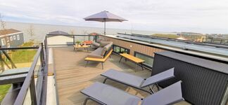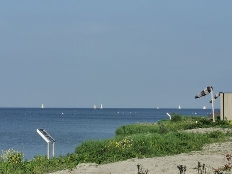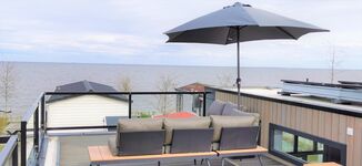 Durch 2 Schiebetüren geht es ebenerdig auf die Terrasse und in den Garten. Hier können Sie am Esstisch mit 6 Stühlen an der Seeluft mit Meerblick Ihre Mahlzeiten einnehmen. Zusätzlich gelangt man über eine seitlich am Haus angebrachte Treppe zur großen Dachterrasse, von der man einen atemberaubenden Rundumblick auf das IJsselmeer und die Umgebung hat. Die Terrasse ist mit Glaselementen windgeschützt eingefaßt. Hier können Sie sich gemütlich in bequemen Loungemöbeln entspannen und den Blick auf das blaue Wasser mit den vielen Segelbooten z.B. bei einem Glas Wein genießen oder sich in den Liegestühlen von der Sonne bräunen lassen.