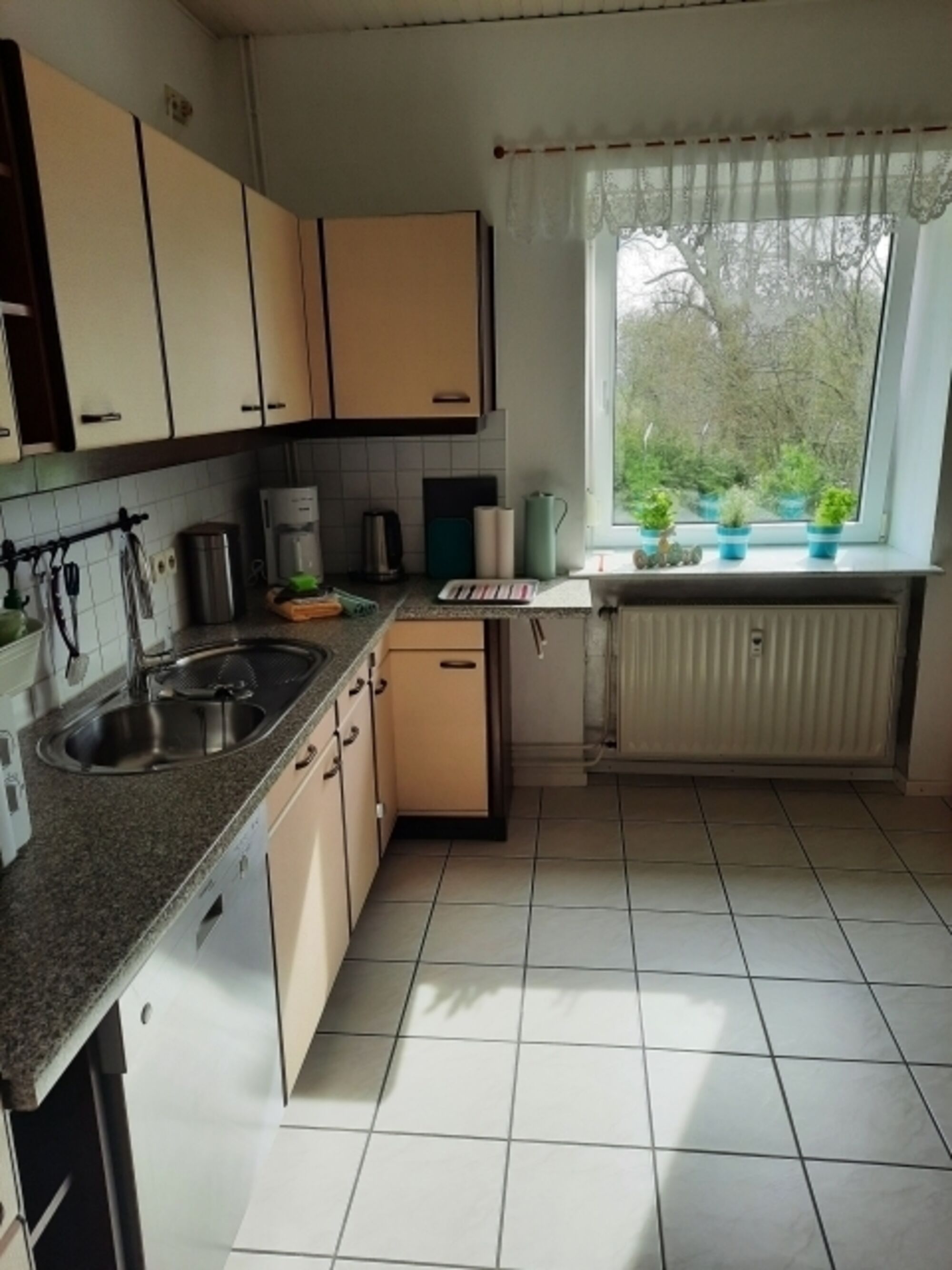 Cerankochfeld, Dunstabzugshaube, Kühlschrank mit Gefrierfach, Korkenzieher / Flaschenöffner, Gewürze (Salz, Pfeffer, Zucker), Öl / Essig, Geschirrhandtücher, Mülltüten, Essplatz in der Küche