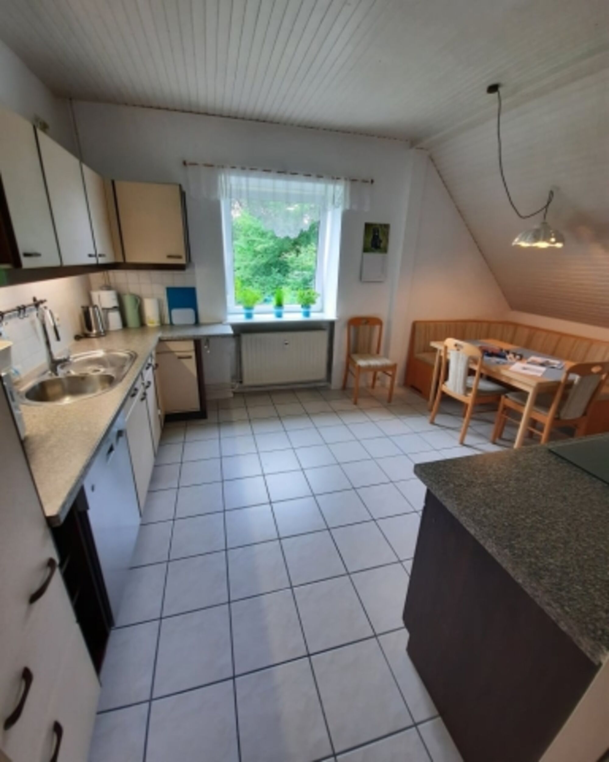 Das gemütliche Wohnzimmer ist mit einem Schlafsofa und zwei Sesseln ausgestattet. Ein Fernseher mit Magenta TV-Stick und DVD-Player und ein abwechslungsreich bestücktes Bücherregal komplettieren die Ausstattung. Die große gut ausgestattete Küche mit Essecke bietet viel Platz für alle Gäste. Im lichtdurchfluteten Bad befindet sich neben Dusche und WC auch eine Eckbadewanne.