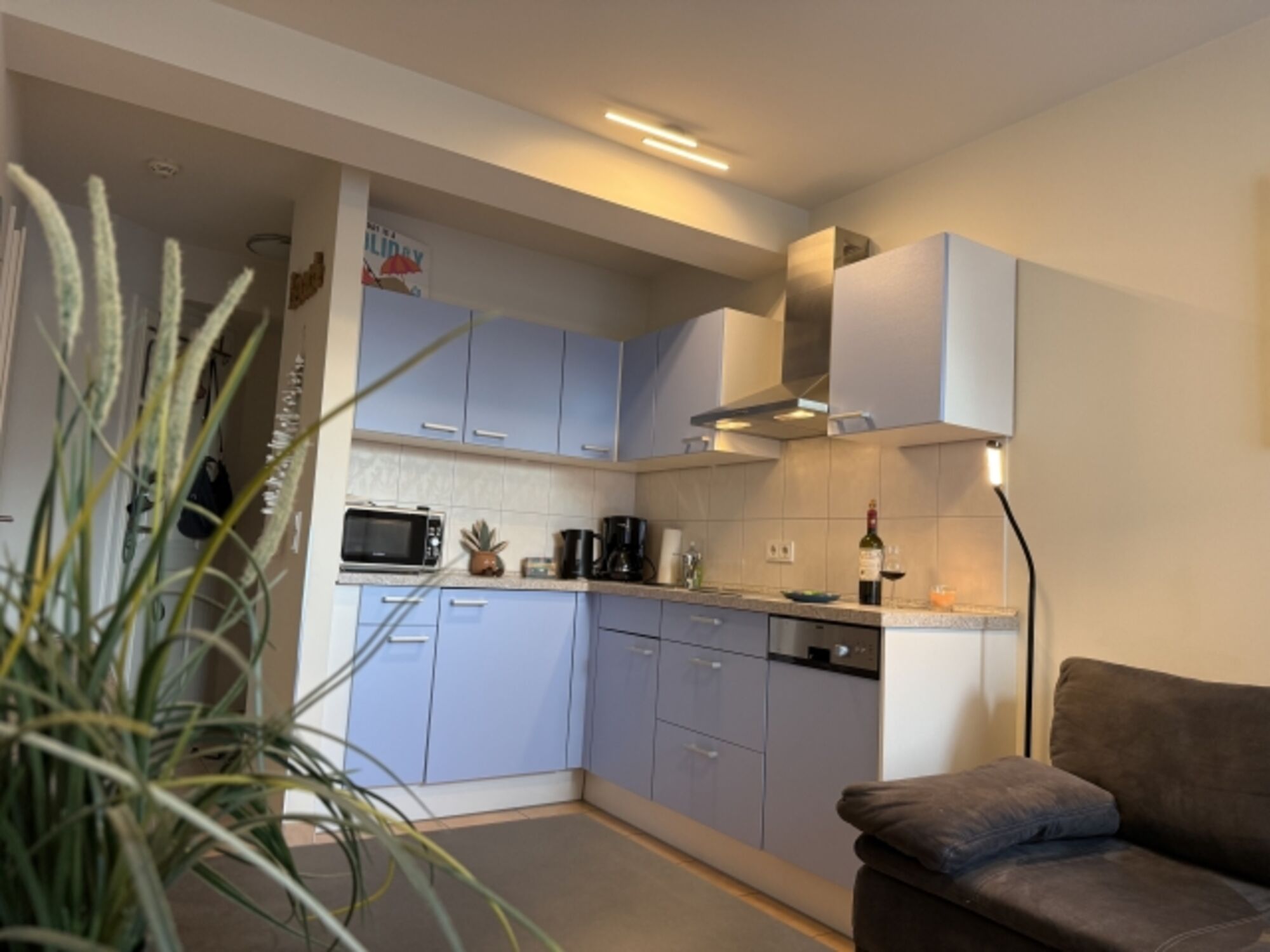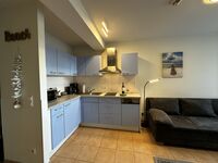 Die ruhig gelegene Wohnung befindet sich in einem offenen Innenhof und bietet einen hellen, offenen Wohn-, Koch- und Essbereich mit gemütlichem Schlafsofa. Die gut ausgestattete Küchenzeile mit Geschirrspülmaschine und Mikrowelle macht die Selbstversorgung unkompliziert – auch im Urlaub mit Hund.