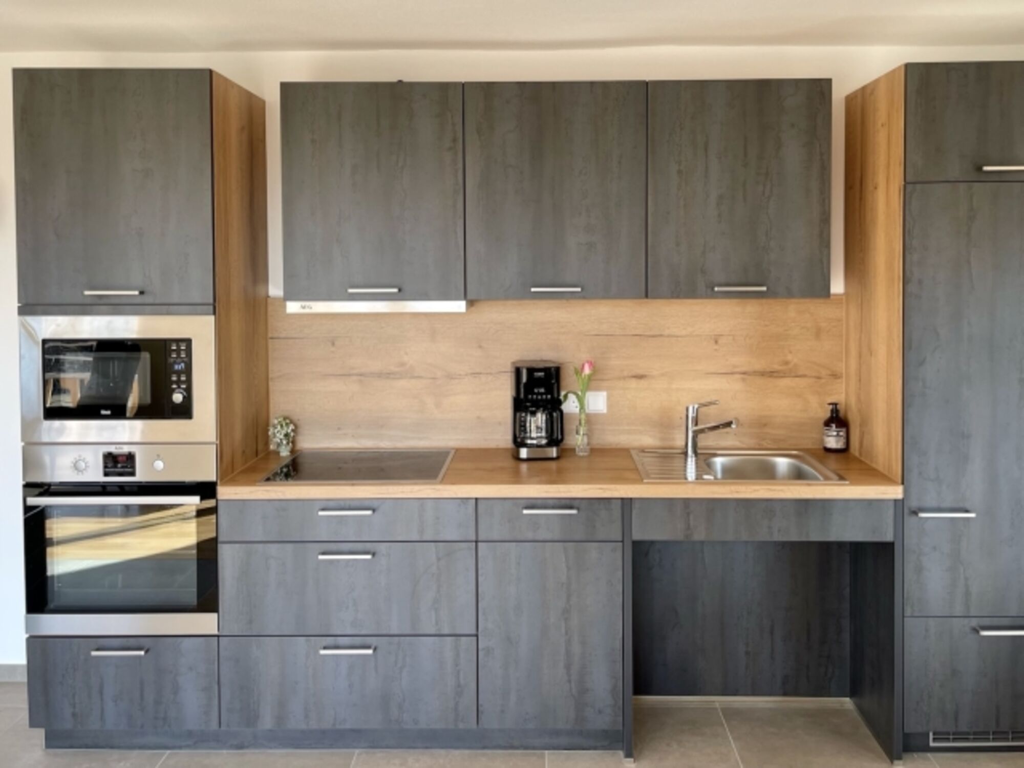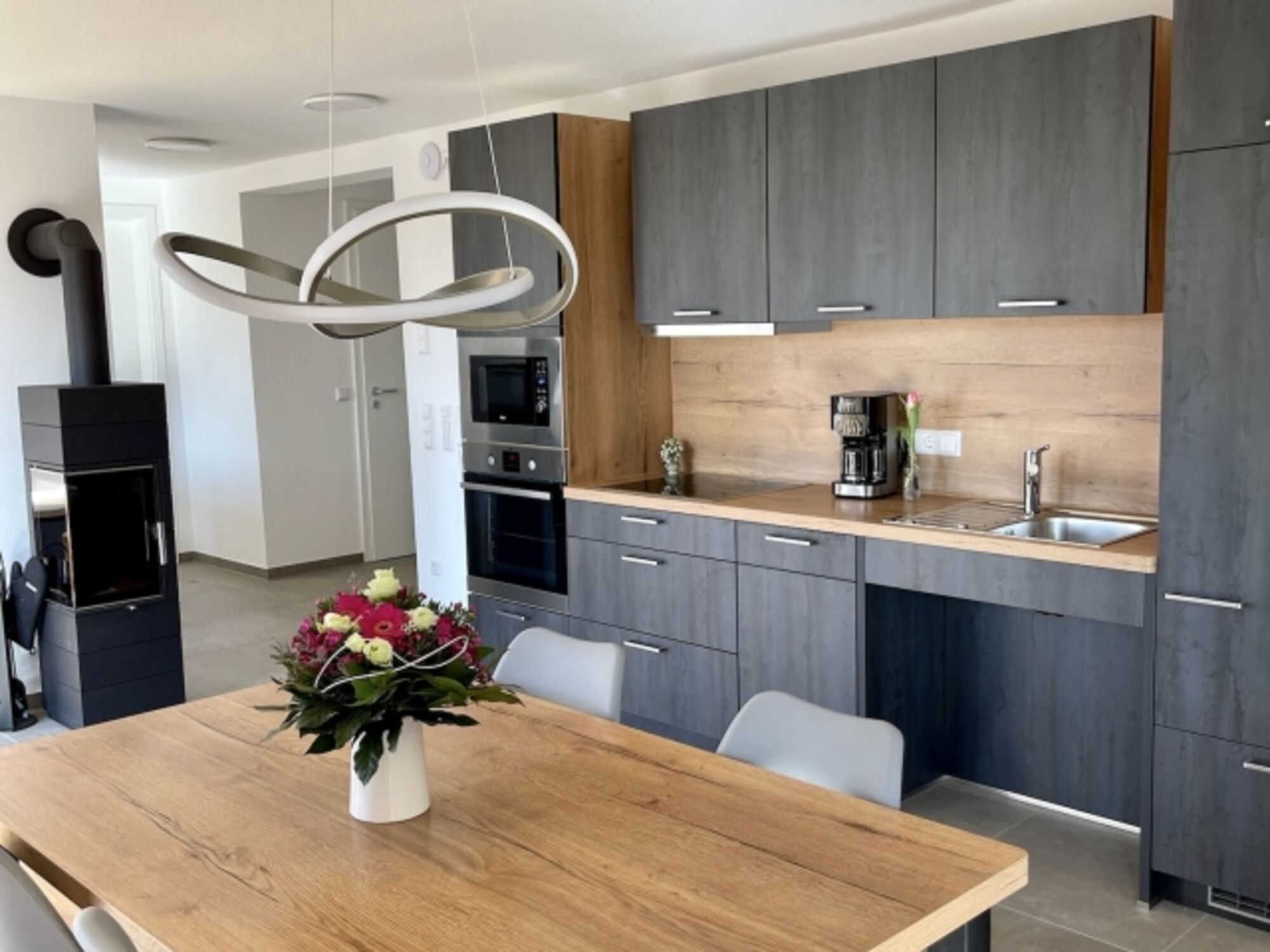 4-Platten Herd, Induktionsherd, Kühlschrank mit Gefrierfach, Eierkocher, Mixer, Geschirrhandtücher, Mülltüten, Essplatz in der Küche