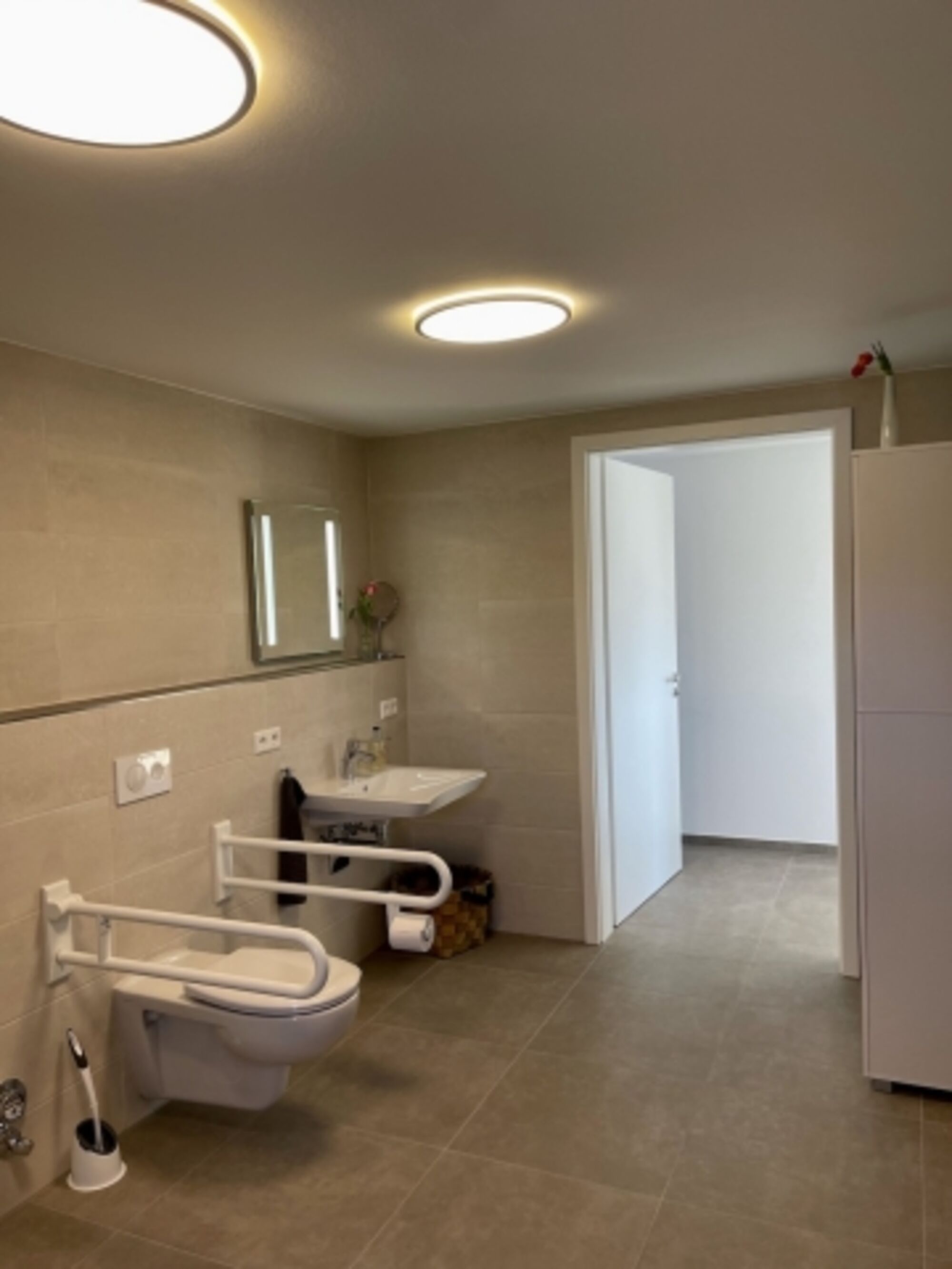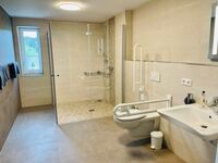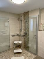 Das großzügige, rollstuhlgerechte Badezimmer ist mit Dusche und Stützgriffen am WC ausgestattet. Ein separater Wäscheraum mit Waschmaschine, Trockner, Bügelbrett und Bügeleisen steht ebenfalls zur Verfügung. Zur Wohnung gehören eine Garage sowie zwei E-Bikes (Verleih).