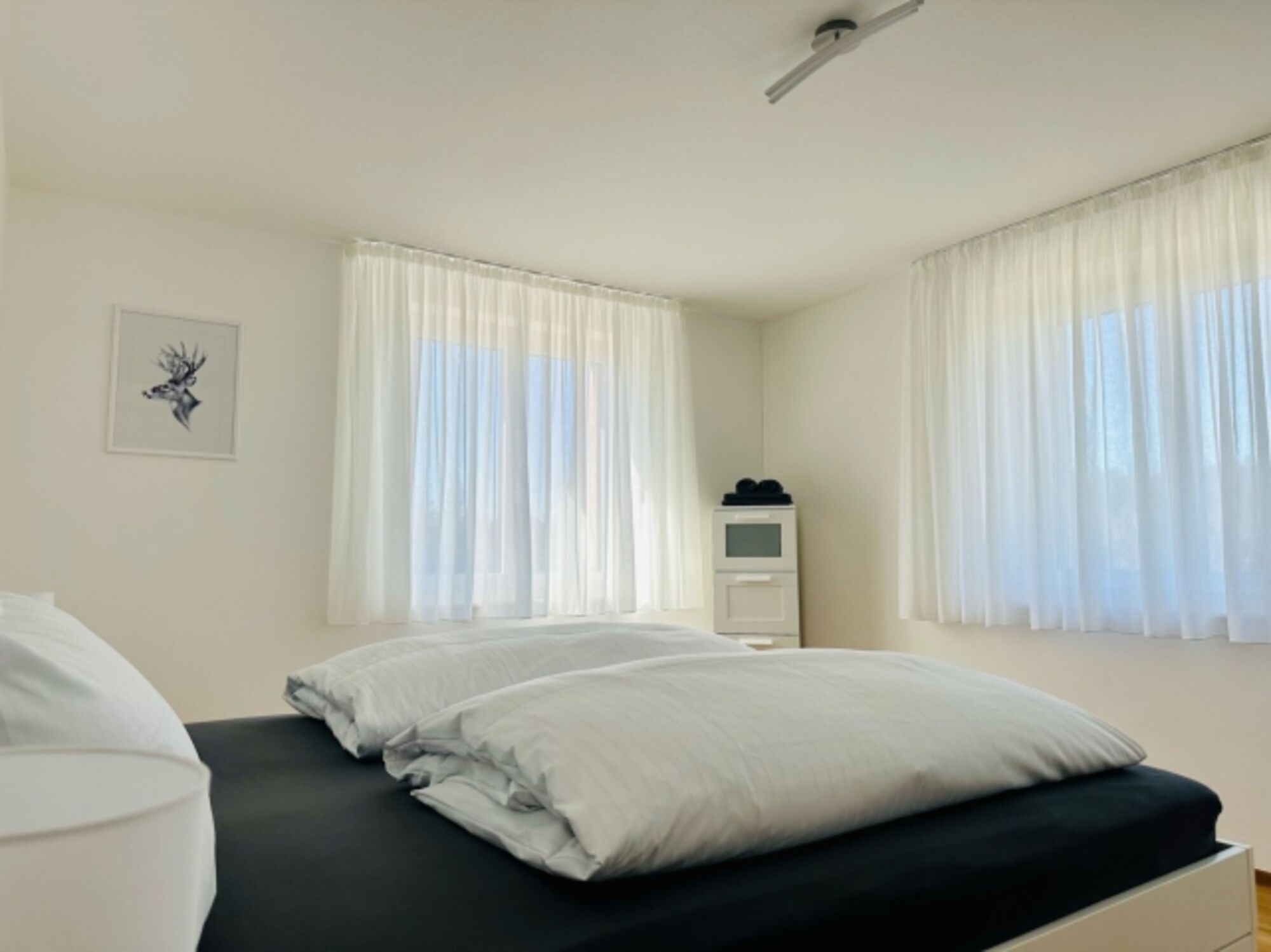 Ein Schlafzimmer verfügt über ein komfortables Doppelbett (1,80 × 2,00 m). Im zweiten Schlafzimmer stehen zwei Einzelbetten (je 0,80 × 2,00 m), von denen eines ausziehbar ist, sodass hier insgesamt drei Schlafmöglichkeiten zur Verfügung stehen.