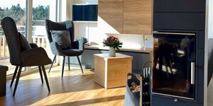 Das gemütliche Wohnzimmer mit TV, Blu-ray-Player und Radio lädt mit Couch und Ohrensesseln zu entspannten Stunden vor dem Schwedenofen ein. Von hier aus gelangen Sie auf den Balkon mit Sitzgruppe und herrlichem Blick auf Wald und Wiesen. Die moderne, voll ausgestattete Küche sowie der Essbereich für bis zu fünf Personen bieten beste Voraussetzungen für gemeinsame Mahlzeiten.
