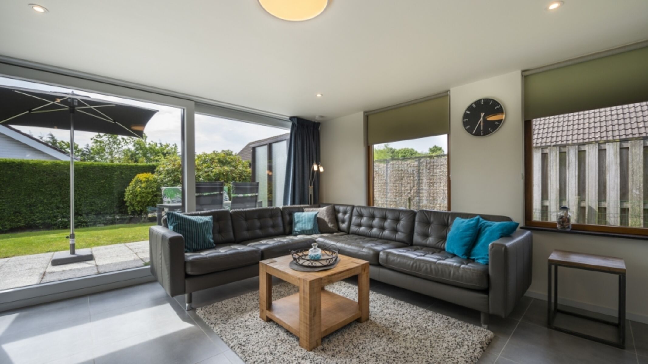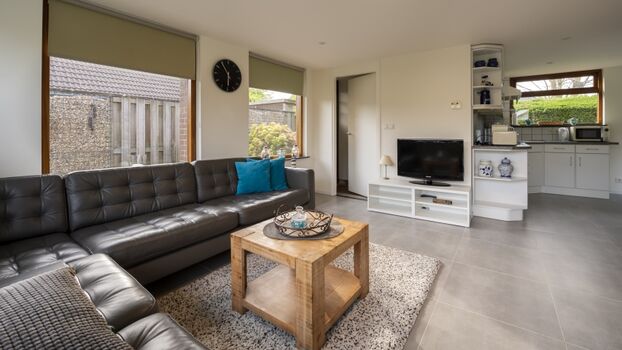 Das Wohnzimmer ist gemütlich eingerichtet und verfügt über ein großes Ecksofa. Ein Flachbildfernseher ist ebenfalls vorhanden. Eine Glasschiebetür führt vom Wohnzimmer auf eine große Sonnenterrasse mit Gartenmöbeln und Markise.