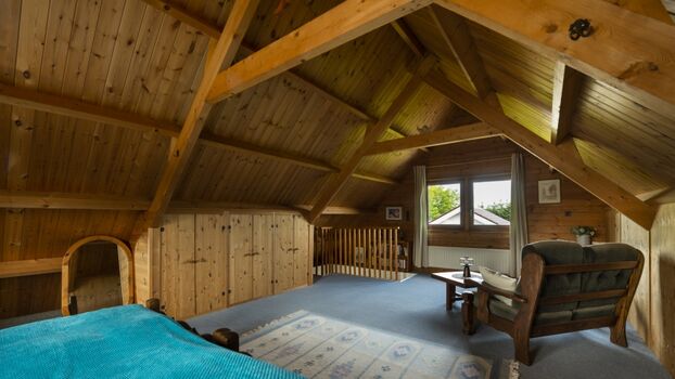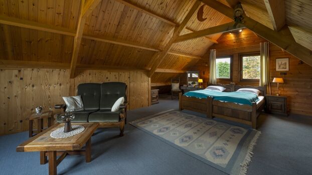 Das erste Schlafzimmer befindet sich im Erdgeschoss und hat ein Doppelbett und ein modernes Badezimmer mit begehbarer Dusche. Im Obergeschoss befindet sich das zweite, sehr geräumige Schlafzimmer mit zwei getrennten Einzelbetten, die bei Bedarf zusammengeschoben werden können. Es gibt auch ein kleines Sofa, auf dem man in Ruhe ein gutes Buch lesen kann. Das Holzdach läuft spitz zu, wodurch der Raum sehr offen und stimmungsvoll wirkt.
