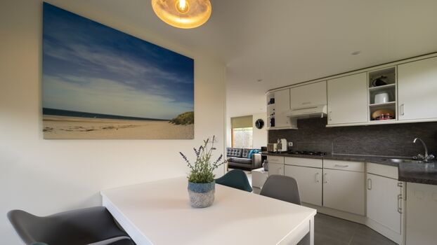 Das Ferienhaus hat eine offene Küche mit einer gemütlichen Essecke. Die Küche ist voll ausgestattet und da sie teilweise mit dem Wohnzimmer verbunden ist, können Sie beim Kochen auch die Gesellschaft Ihrer Freunde oder Familie genießen. Das gesamte Erdgeschoss ist mit einer Fußbodenheizung ausgestattet.