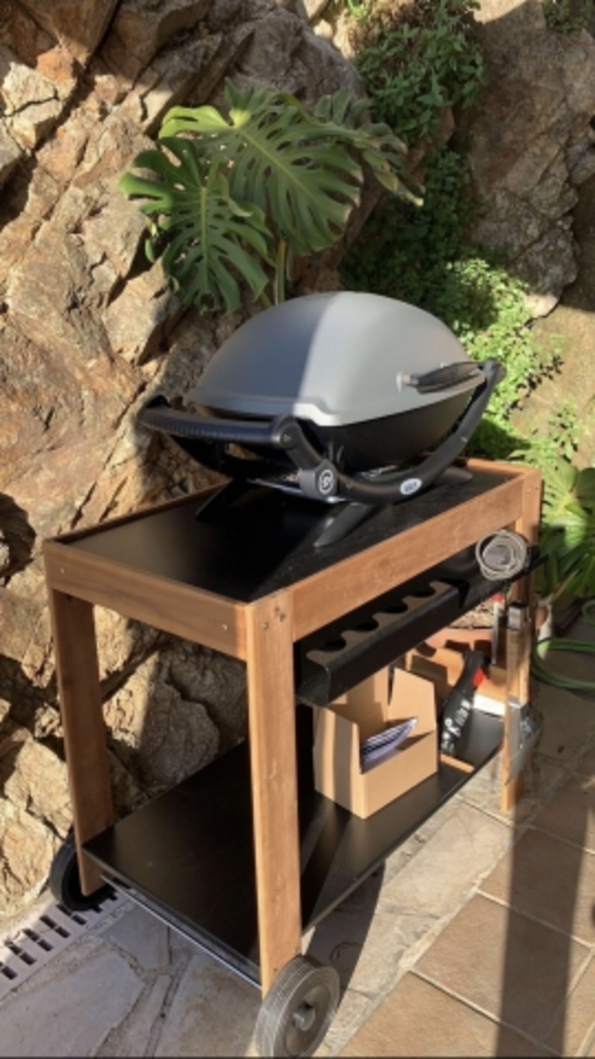 6. Auf der Terrasse befinden sich hochwertige Liegen und Loungemöbel, draußen unter der Überdachten Terrasse ein ausziehbarer Holzesstisch und ein elektrischer Weber-Grill