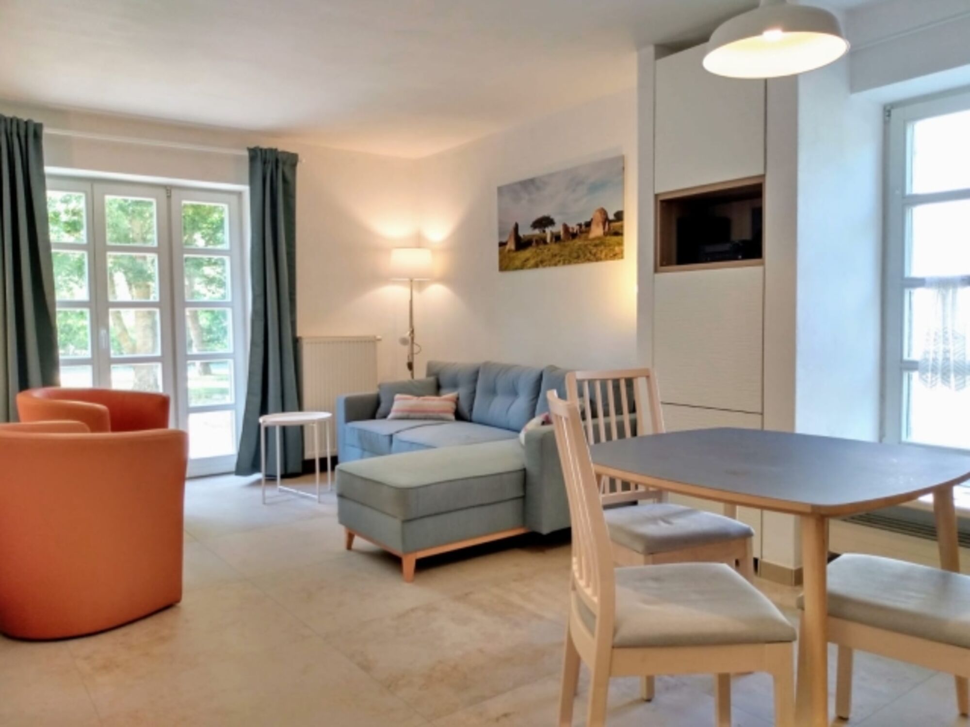 Hell und freundlich gibt sich das Wohnzimmer mit gut ausgestatteter Einbauküche. Einbaumöbel sorgen für ein luftiges Ambiente, zeitloser Feinsteinzeug-Boden für Behaglichkeit. Im Schlafzimmer finden Sie ein Doppelbett mit neuwertigen Matratzen, im Wohnzimmer ein Sofa, dass sich zum 1,40m breiten Bett ausziehen lässt.