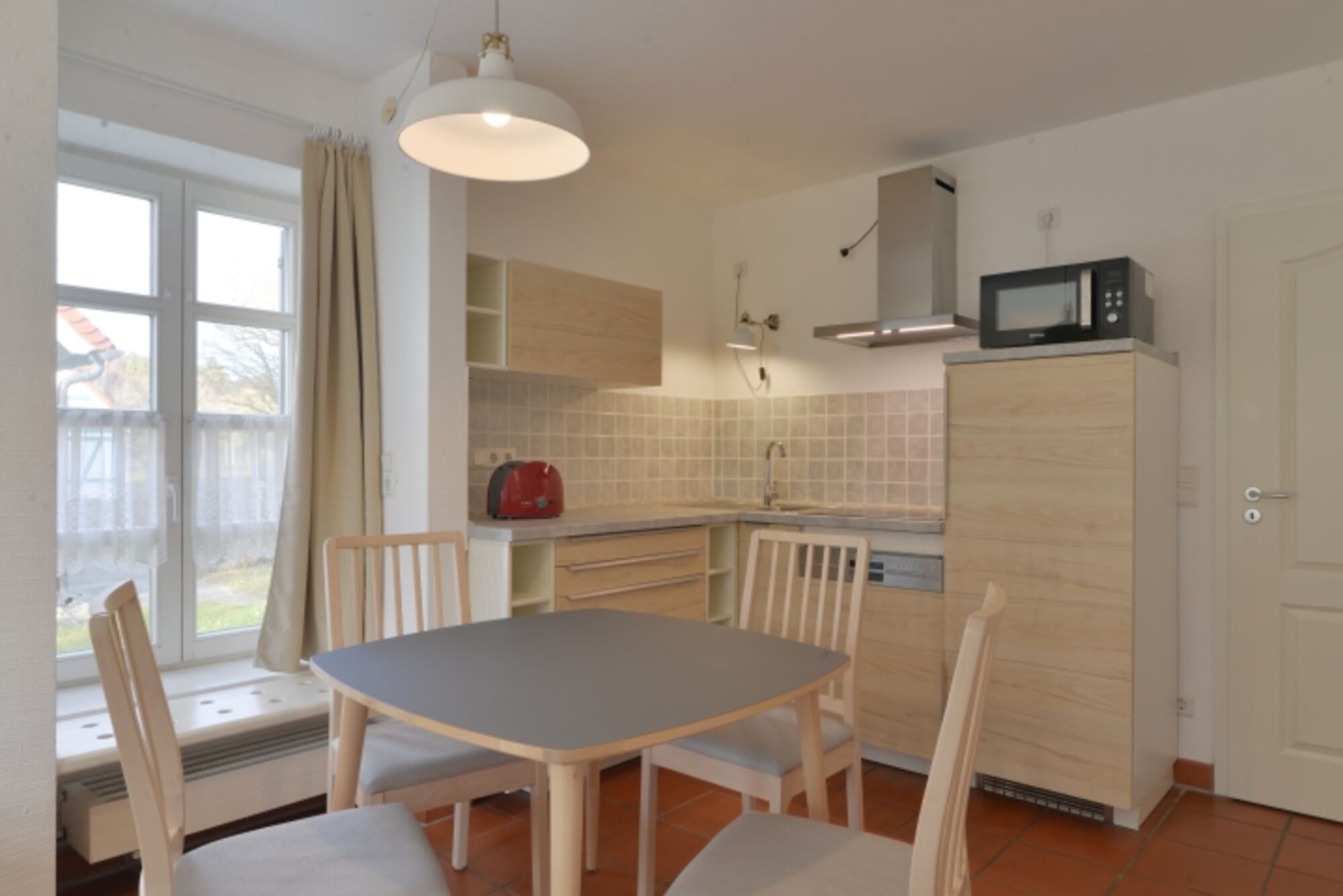 4-Platten Herd, Cerankochfeld, Dunstabzugshaube, Kühlschrank mit Gefrierfach, Eierkocher, Korkenzieher / Flaschenöffner, Essplatz in der Küche