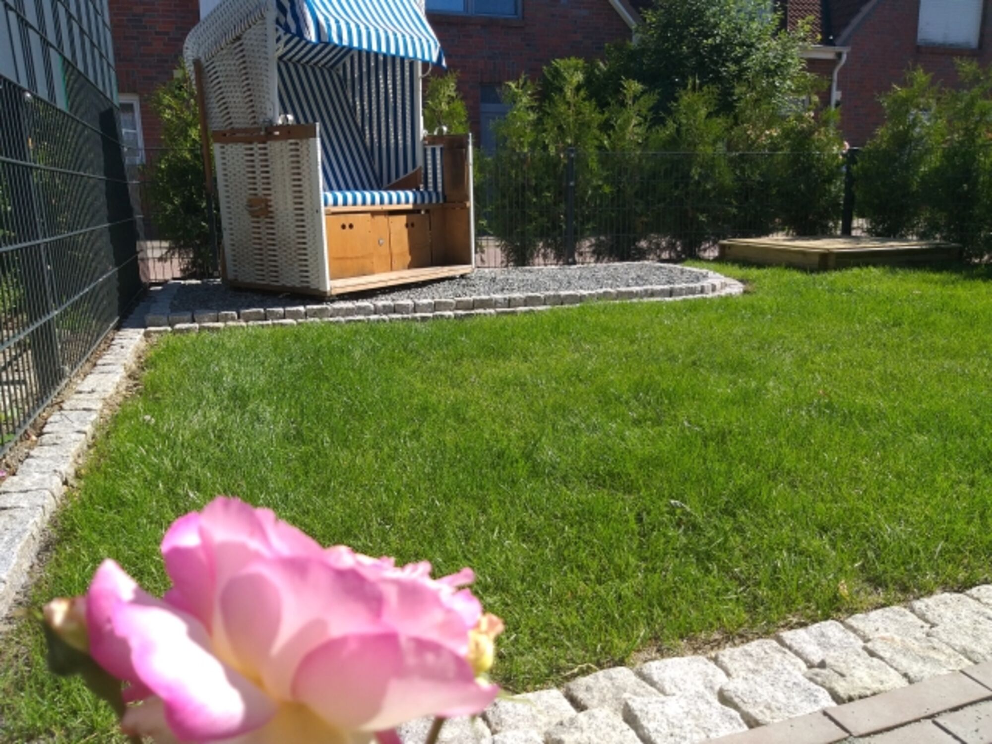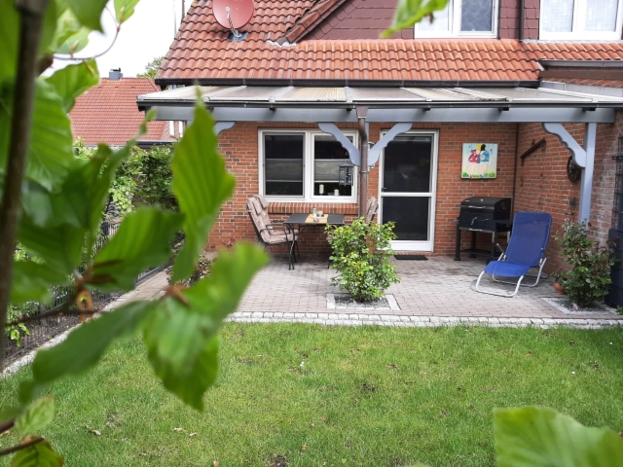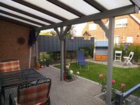 Im Garten lädt die überdachte Terrasse zum Grillen und Relaxen ein oder Sie genießen ein Sonnenbad im Strandkorb.