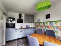 Küche mit Geschirrspüler,Kühlschrank ,Elektrogeräte,Mikrowelle und Ausgang zum großen eingezäunten Garten mit Sauna,Strandkorb und Spielturm für kleine Gäste.