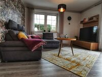Wohnzimmer mit Essecke,TV , WLAN, Ausgang zur überdachten Terasse und eingezäuntem Garten vorne .