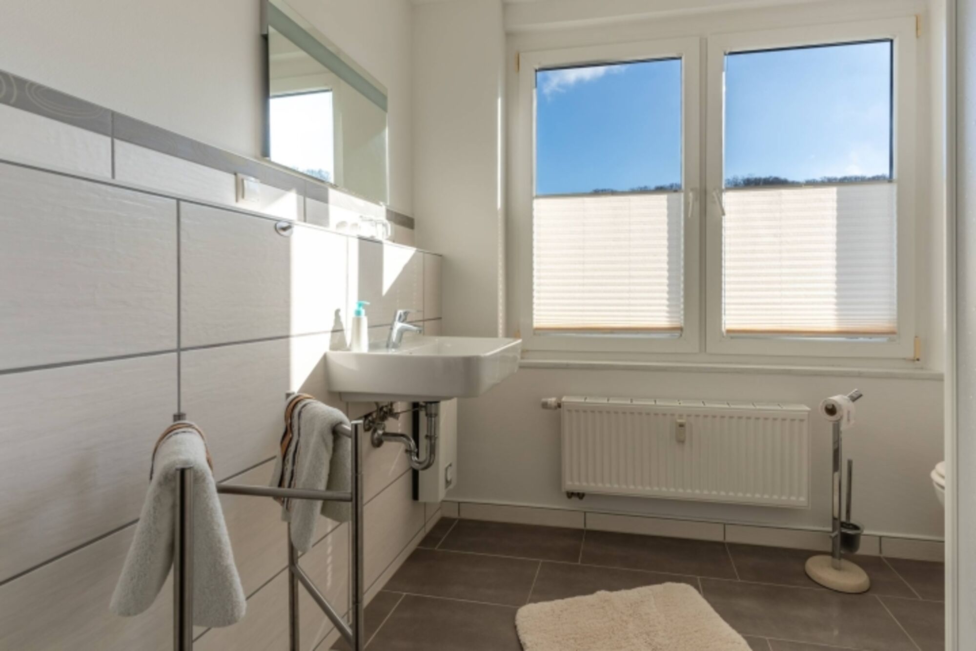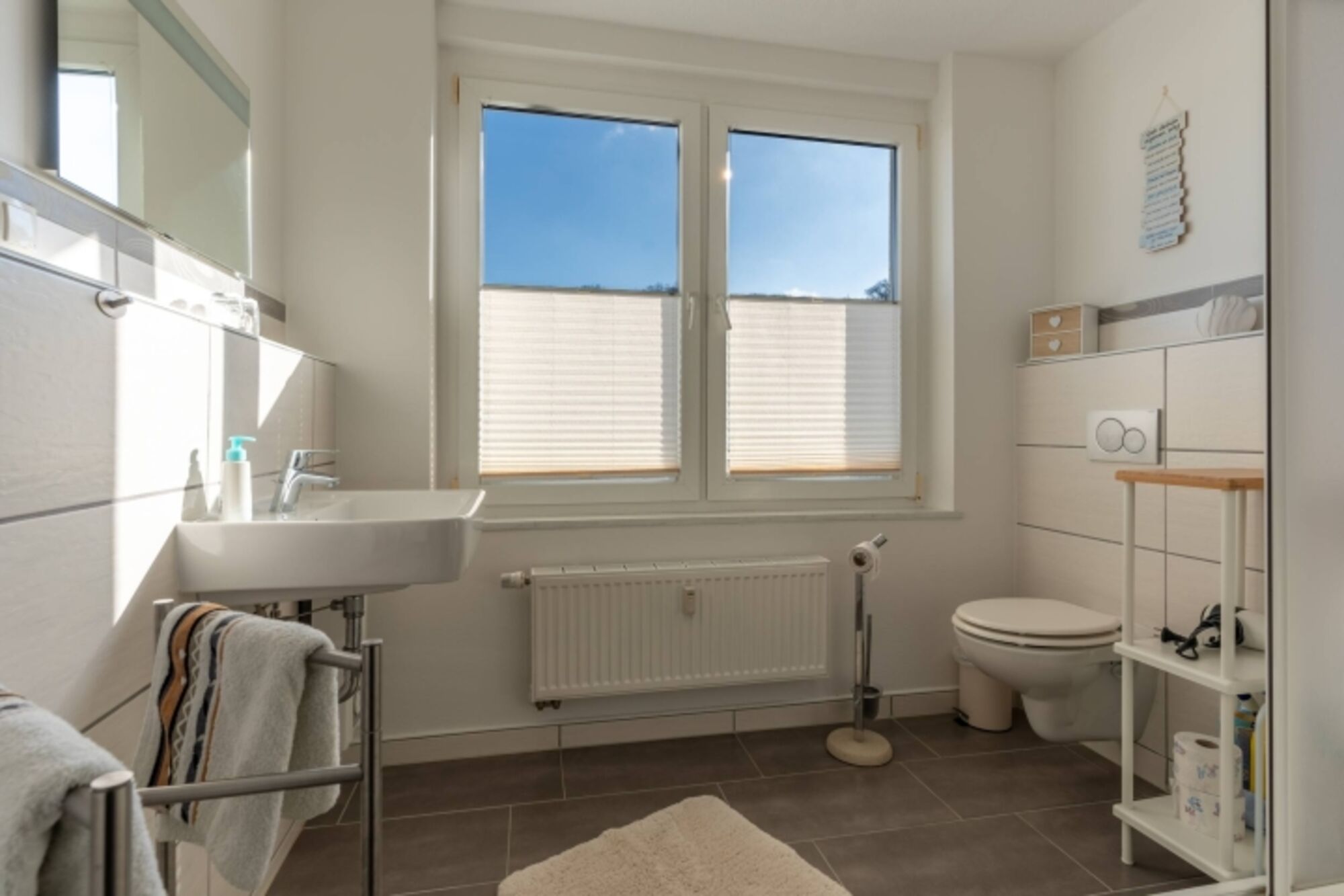 Das helle Tageslichtbad ist modern eingerichtet und mit einer erfrischenden Dusche ausgestattet. Hier können Sie sich nach einem entspannten Tag am Strand revitalisieren. Die freundliche Atmosphäre und die ansprechende Ausstattung werden Ihren Aufenthalt angenehm gestalten.
