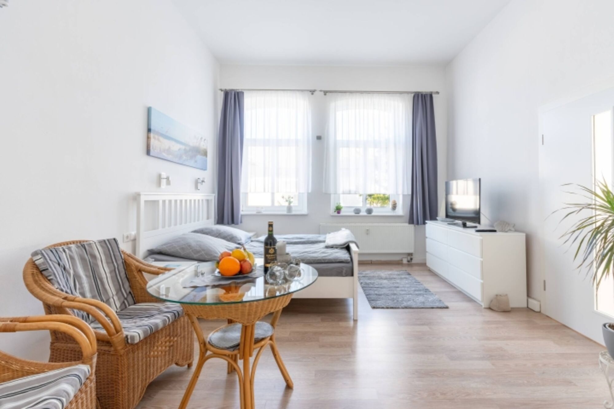 Beim Betreten der Wohnung werden Sie von einem warmen und einladenden Ambiente empfangen. Der Wohn- und Schlafbereich ist mit einem bequemen Doppelbett ausgestattet. Hier können Sie nach einem erlebnisreichen Tag entspannen, während der Flachbild-TV für unterhaltsame Abende sorgt. Für Familien mit Kleinkindern ist die Ferienwohnung ideal, da sie Platz für ein Kind bis 3 Jahre bietet. Auch Ihr vierbeiniger Freund ist herzlich willkommen – die Wohnung ist hundefreundlich, sodass Ihr Hund Sie im Urlaub begleiten kann.