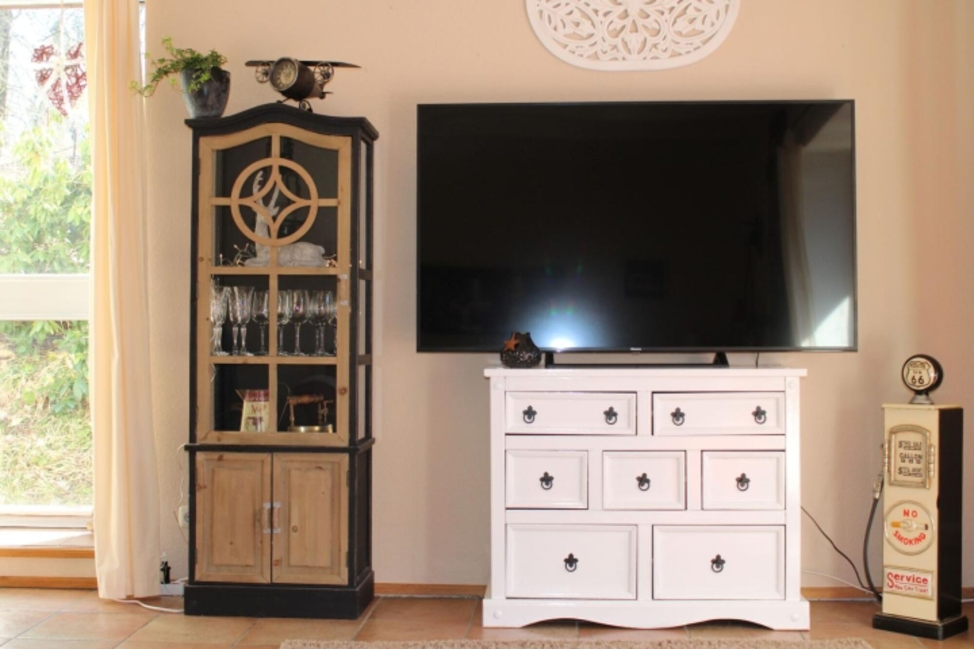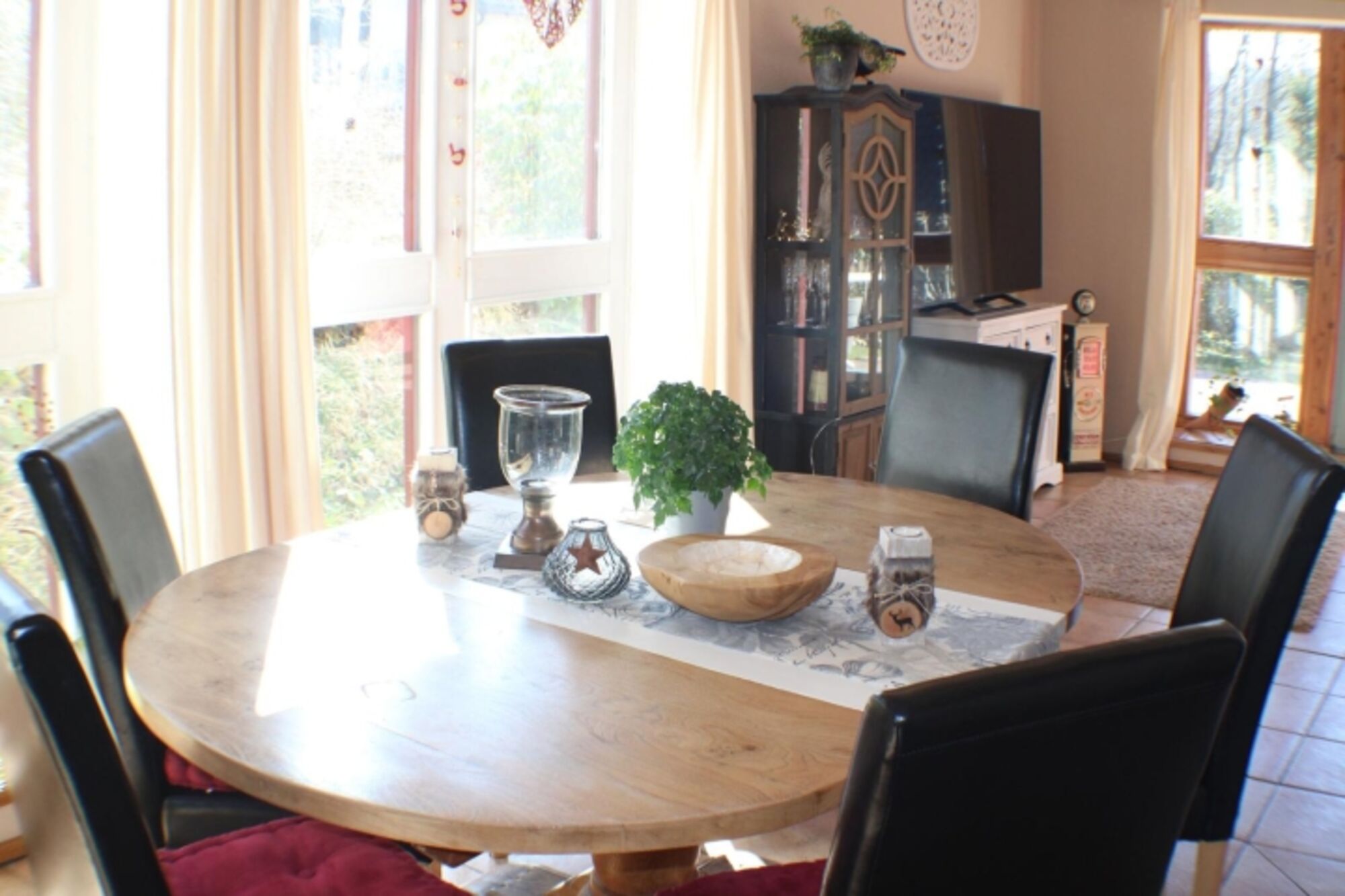 Die Einrichtung besticht durch ihren besonderen Charme im trendigen und modernen Stil. Die großen Holzbalken an der Decke sorgen für einen rustikalen Landhauslook. Im Wohnzimmer befindet sich ein 65 Zoll Fernseher mit Smart TV und 4 K. Die 3 Schlafzimmer bieten ausreichend Platz für 6-8 Personen und der knisternde Kaminofen im offenen Wohn-/Ess- und Kochbereich sorgt für eine gemütliche Atmosphäre. Außerdem befindet sich im Erdgeschoss noch ein Gäste-WC. Das sonnendurchflutete und helle Ferienhaus ist voll ausgestattet und wird regelmäßig modernisiert. Unsere Küche ist perfekt für Sie eingerichtet. Sie finden unter anderem eine Kaffeemaschine, Senseo Padmaschine, Mikrowelle, Wasserkocher, Herd, Backofen, Eierkocher, Geschirrspüler, Kühlschrank und Minigefrierschrank und ein umfangreiches Sortiment an Geschirr und Gläsern.