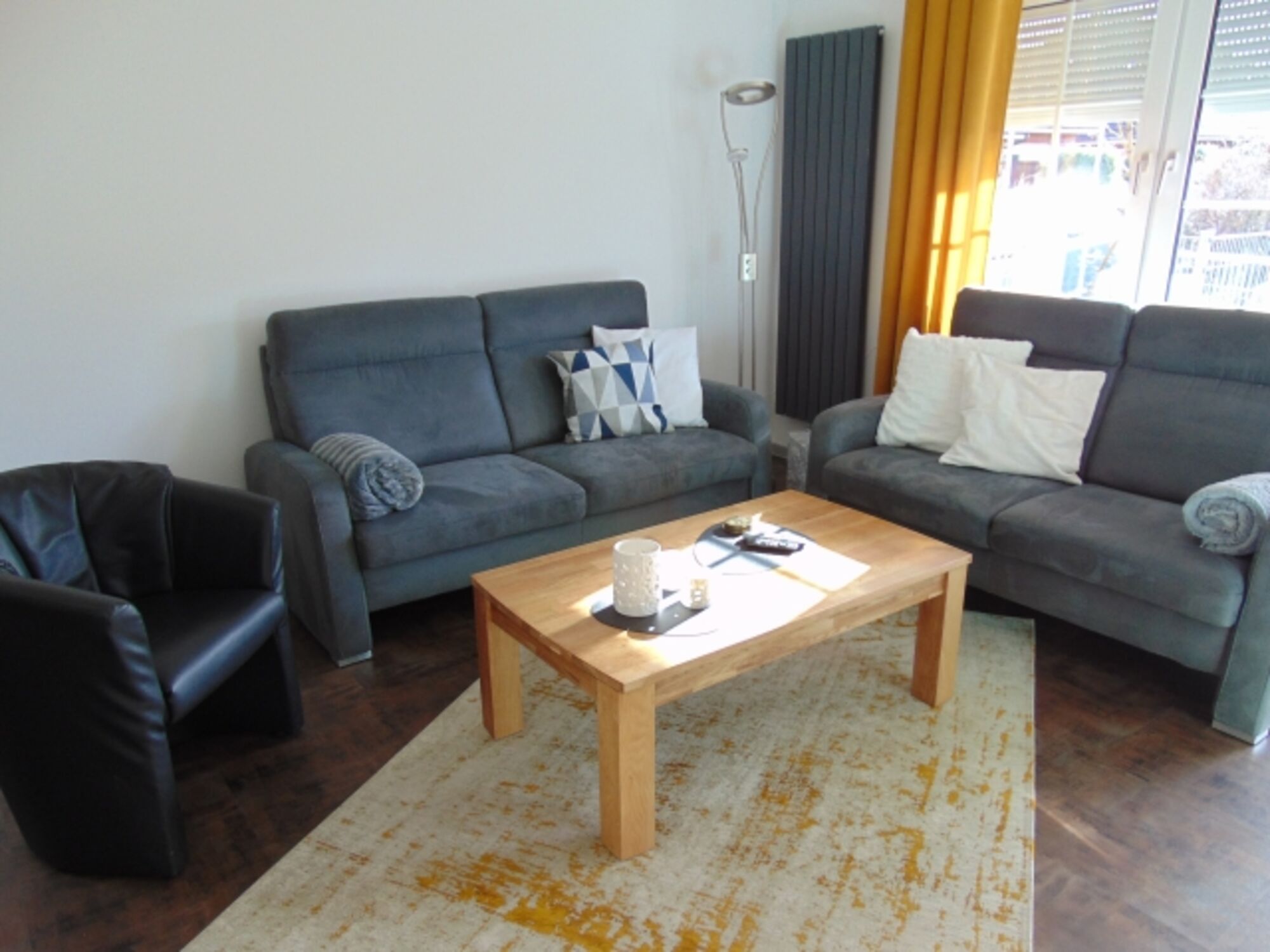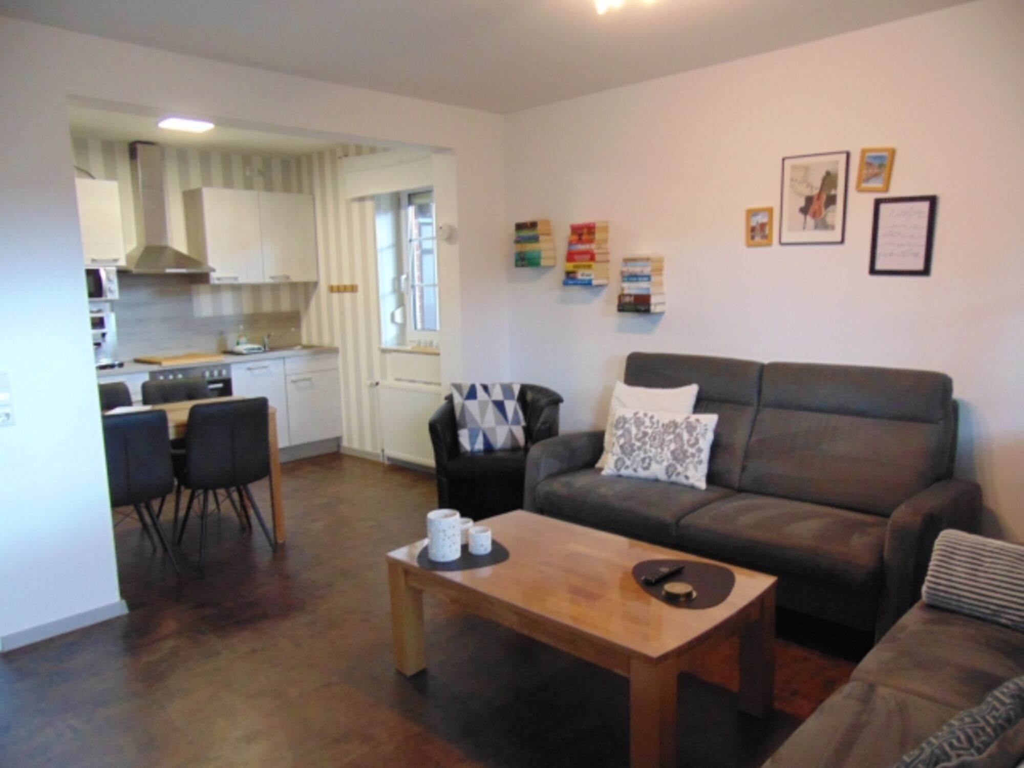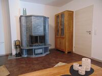 Wohnzimmer Kamin, Fernseher , WLAN, Ausgang zur windgeschützten, überdachten Südterasse und eingezäuntem Garten vorne .