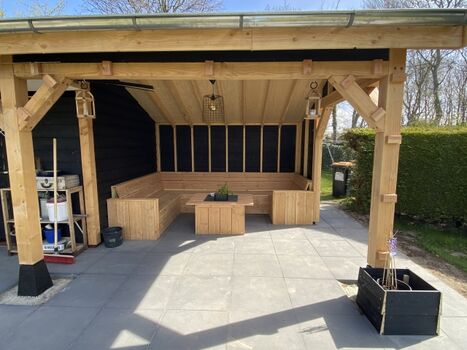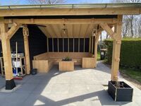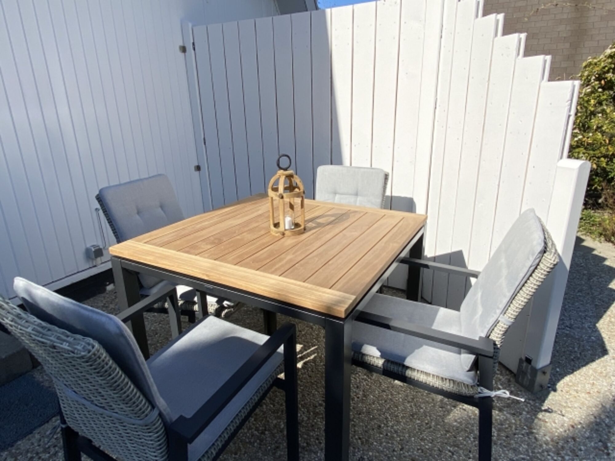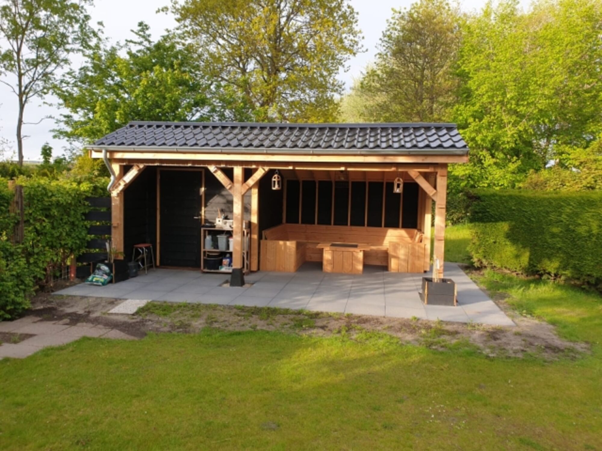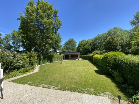 Der großzügige Garten hat eine große Rasenfläche, Terrassen und eine Überdachung mit Lounge-Set. Das Ganze ist mit Pflanzen und Zäunen eingezäunt, so dass es viel Privatsphäre gibt.