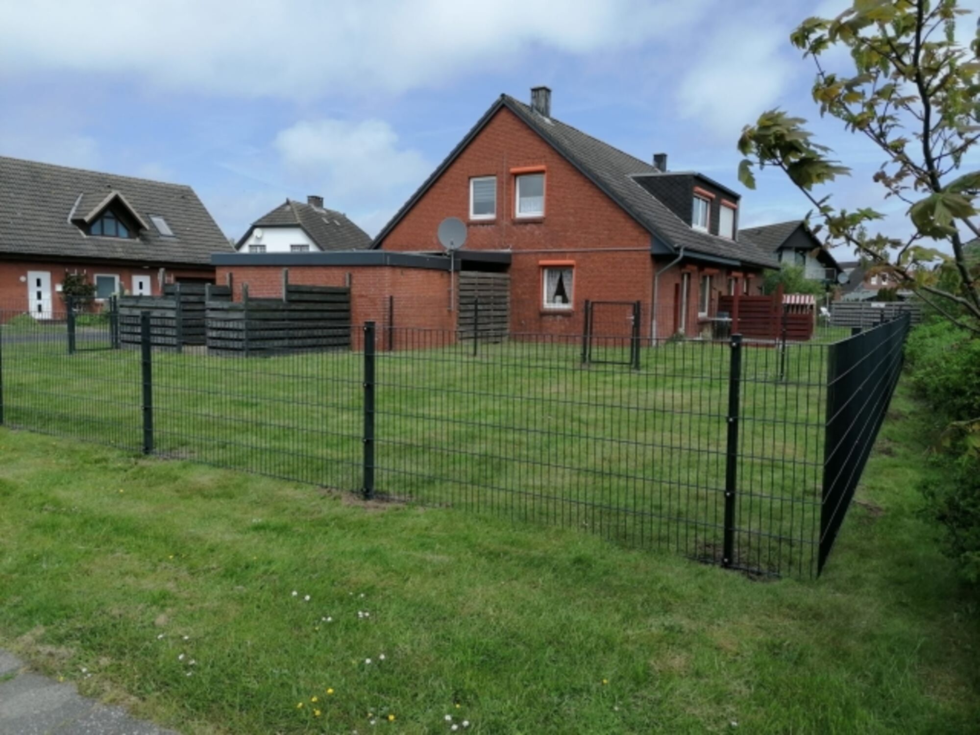 Das Grundstück ist komplett mit einem 1,22 m hohen Doppelstabmattenzaun mit Sichtschutz eingezäunt. Jeder der beiden Wohnungen steht ein eigener eingezäunter Garten zur Verfügung.