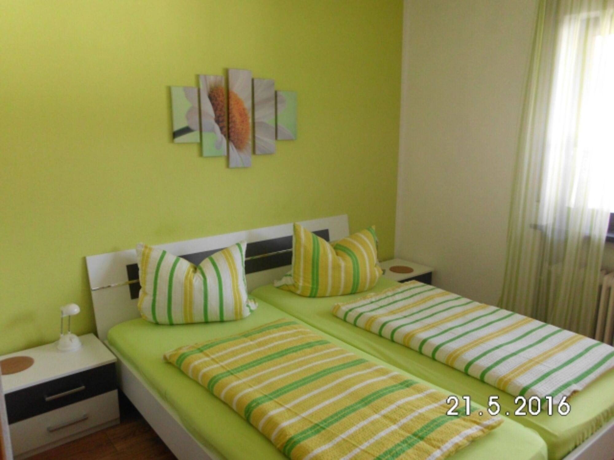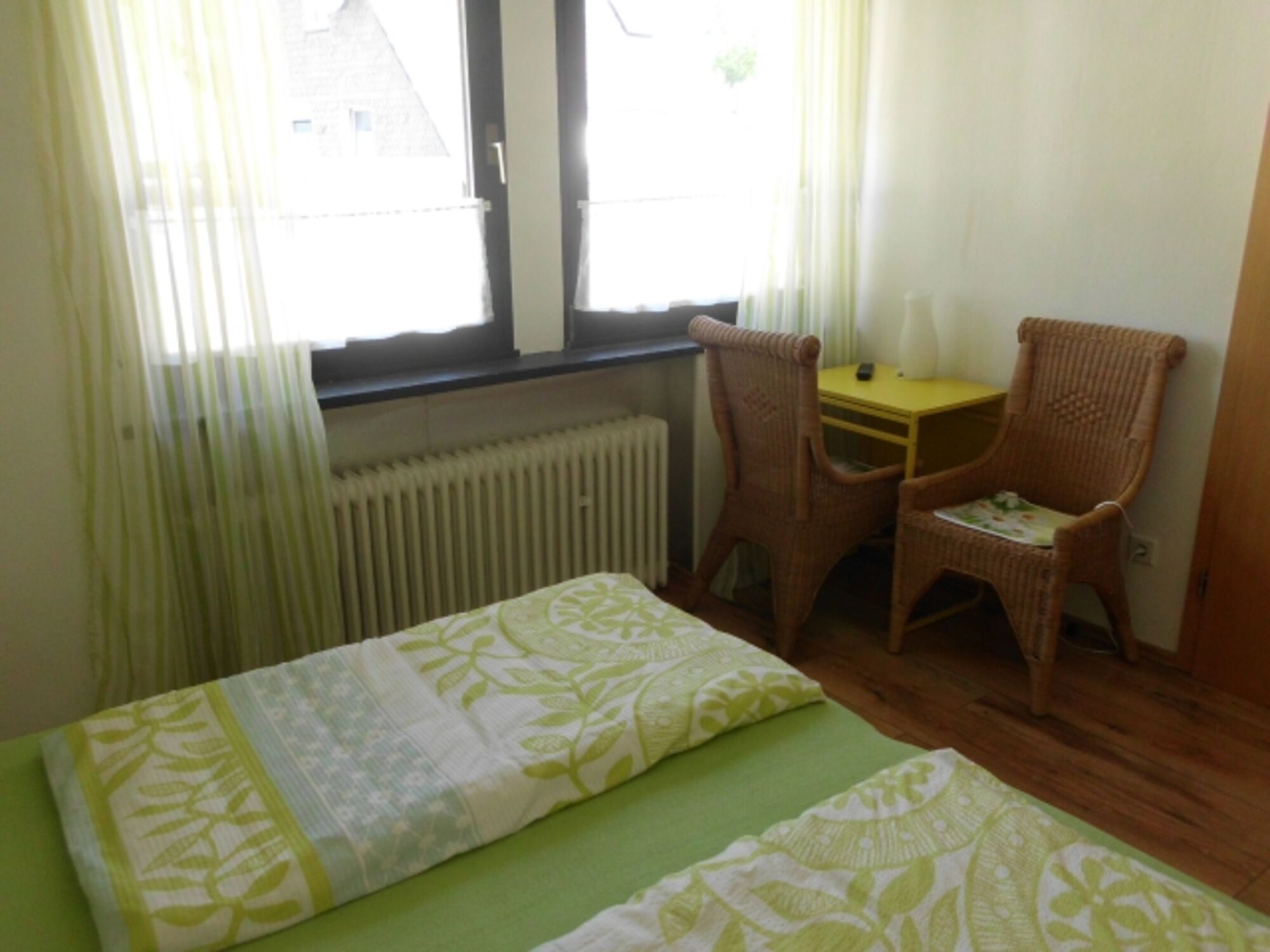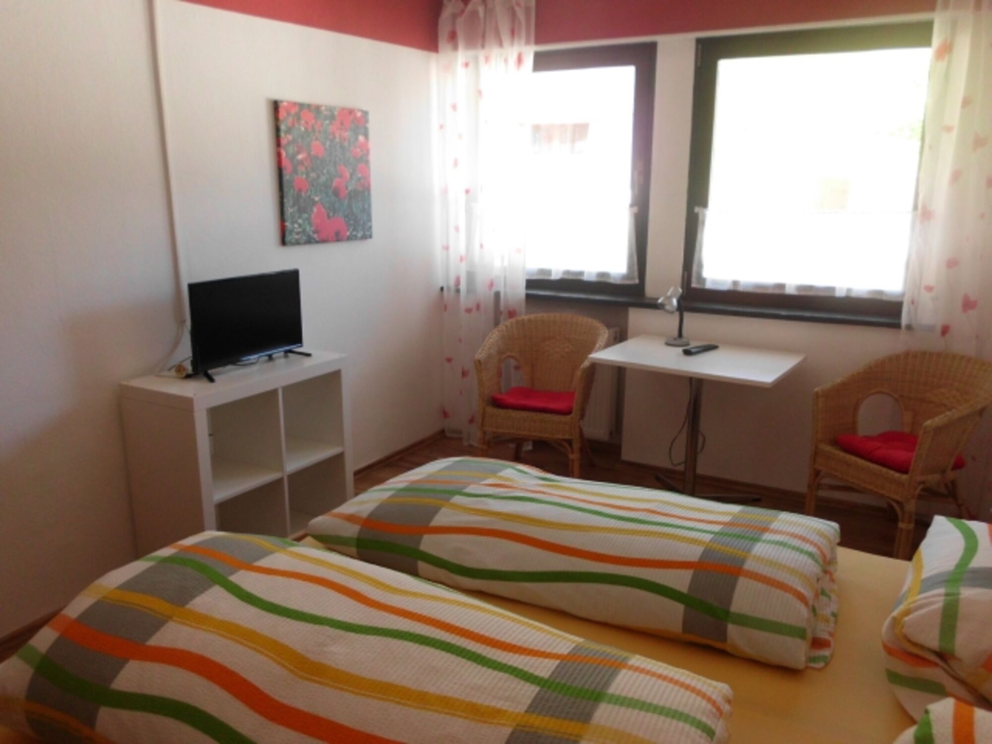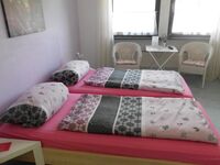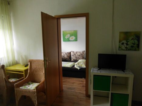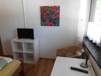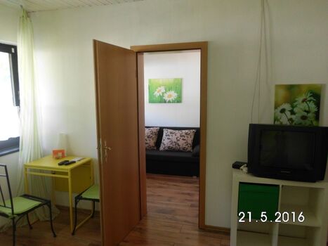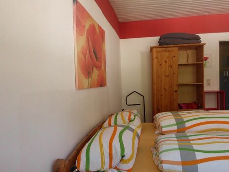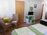 Es handelt sich um ein Familienzimmer in einer Frühstückspension. Das Zimmer besteht aus einem Doppelzimmer mit Dusche/WC, TV und kleiner Sitzmöglichkeit und einem 2. kleinen Zimmer mit einer Schlafcouch (1,40 m breit) für bis zu 2 Kinder bis 13 Jahre oder einem Babybett. Doppelbett 1,80 x 2,00m, Spiegel, Leselampe am Bett