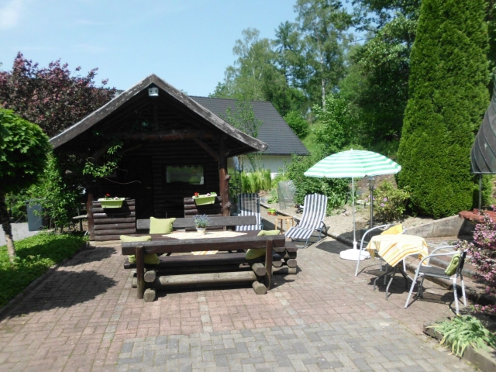 Es steht Ihnen eine Gästeterrasse mit Liegen, Sitzgelegenheiten, Grill und einer Hütte zur Verfügung. In der Hütte können Sie abends zusammen sitzen. (Im Winter mit Heizung € 10,00)