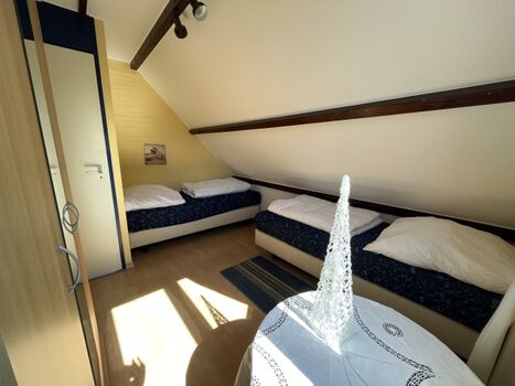 Im Obergeschoß sind 3 Schlafräume vorhanden. Ein mit einem 160x200cm Doppelbett,1 mit 2 Einzelbetten(neue Boxspringbetten) und ein Einzelzimmer mit ausziehbarem Bett
