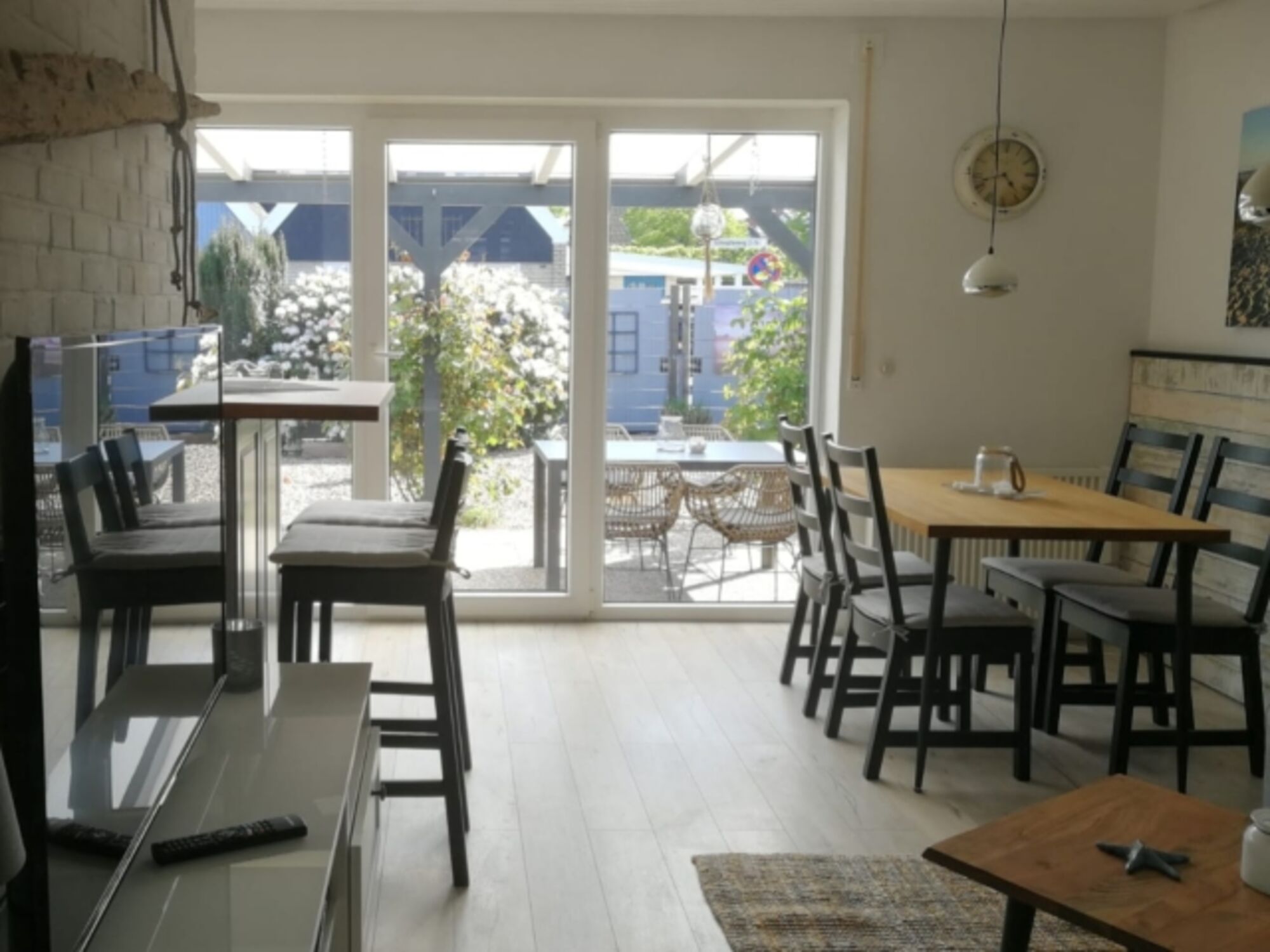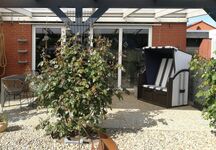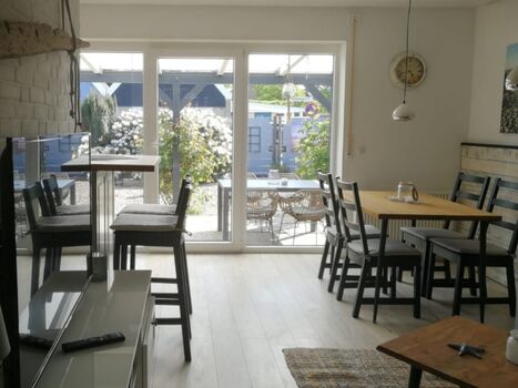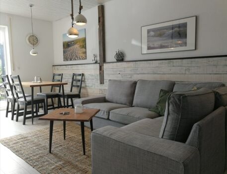 Im Wohnbereich wartet ein gemütliches Ecksofa. Direkt vom Wohnzimmer aus gelangt man auf die große überdachte Terrasse. Der Garten ist ausbruchsicher eingezäunt und liegt in Süd-West-Lage. Die vielen Gräser und das Kiesbeet verleihen einem das Gefühl, dass die Nordsee nicht weit entfernt sein kann.