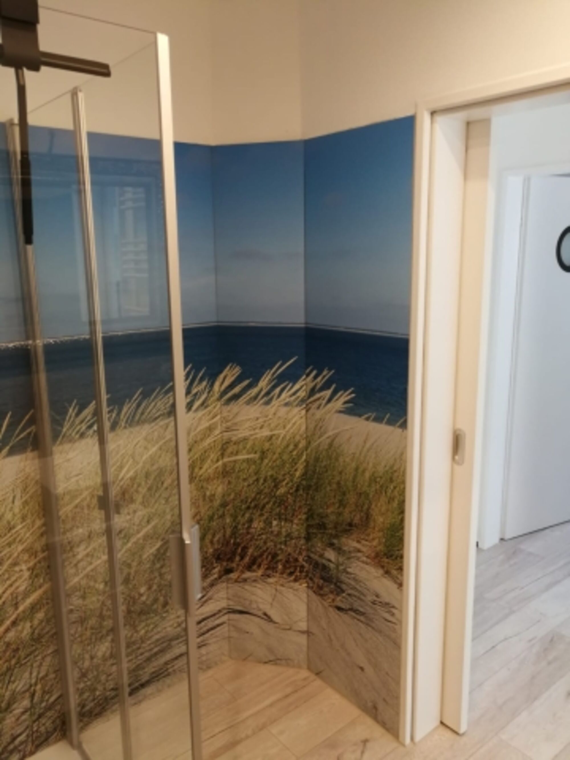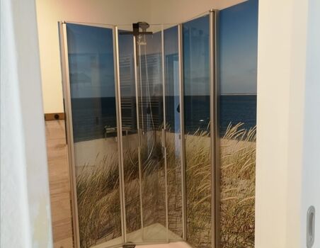Das Bad ist mit einer Dusche mit Rundumblick auf die Nordsee. Ein Highlight des Hauses.
